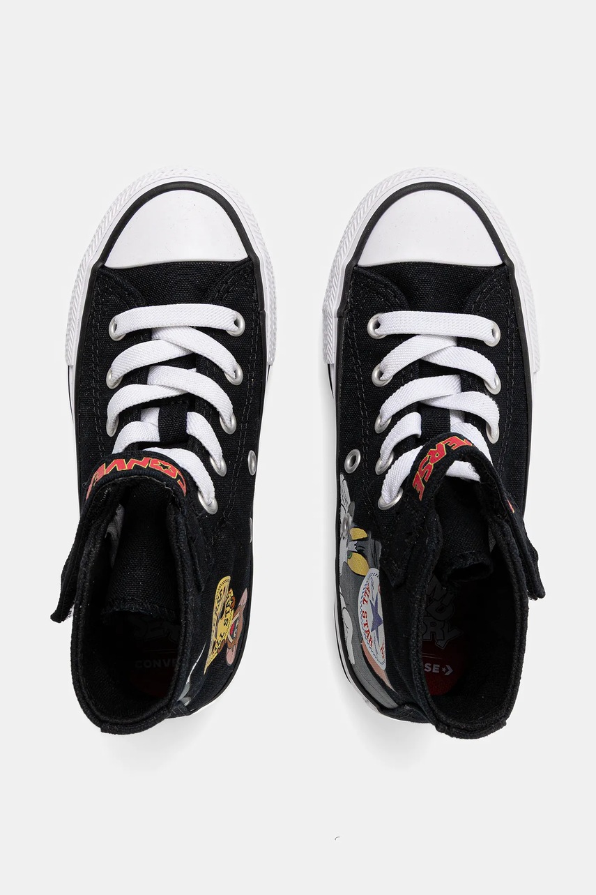 Czym wyróżniają się dziecięce trampki Converse A15114C?Cholewka wykonana z wysokogatunkowego materiału tekstylnego gwarantuje optymalną przewiewność i lekkość, co przekłada się na komfort noszenia przez cały dzieńWysoka konstrukcja za kostkę zapewnia stabilizację stawu skokowego oraz chroni stopę podczas codziennego użytkowaniaPłaska podeszwa o grubości 0-2 cm oferuje naturalne ułożenie stopy, pozwalając na swobodny ruch i wygodę podczas chodzeniaWkładka z materiału włókienniczego poprawia miękkość wnętrza buta i wspiera komfortowe dopasowanie do kształtu stopySystem zapięcia na rzep umożliwia szybkie zakładanie oraz indywidualną regulację szerokości w obrębie podbiciaOkrągły nosek nadaje klasycznego wyglądu oraz zwiększa swobodę dla palców, podnosząc walory użytkowe modeluZabudowana konstrukcja skutecznie chroni palce przed przypadkowymi uderzeniami i wpływem czynników zewnętrznychModel z licencjonowanym wzorem podkreśla oryginalność oraz autentyczność marki Converse