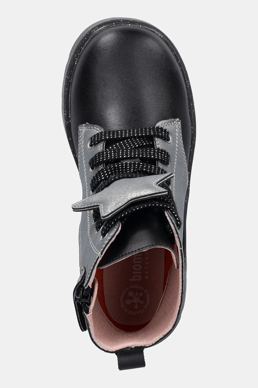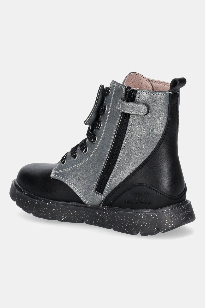 - Sznurowany model z bocznym zapięciem na suwak i rzep.
