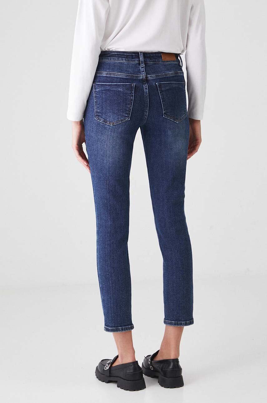 - Fason slim - jeansy o dopasowanym kroju z wąską nogawką, zarówno w okolicach ud, jak i kostki. Podkreślają naturalną linię sylwetki, lecz jej nie opinają - są komfortowe w codziennym użytkowaniu.