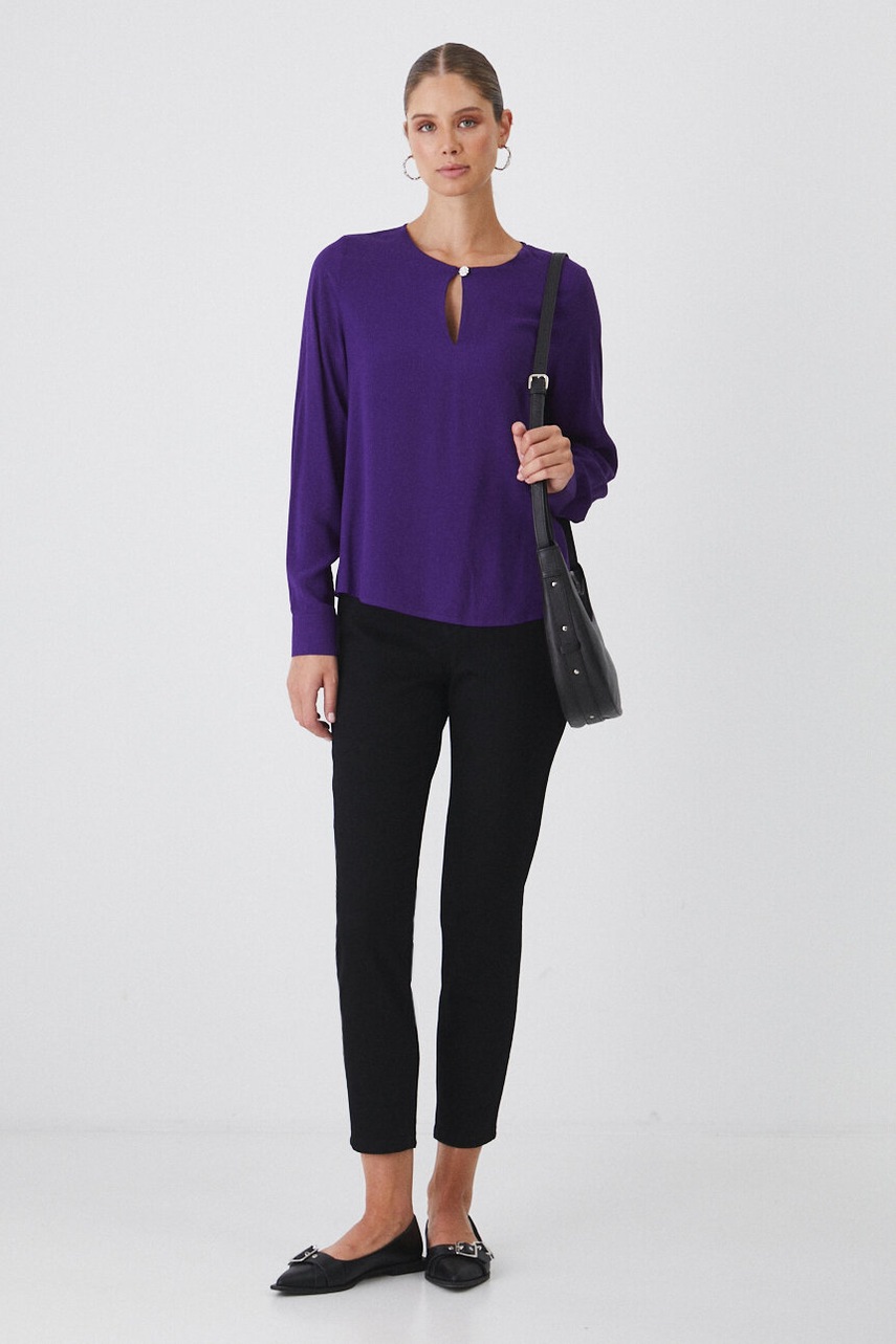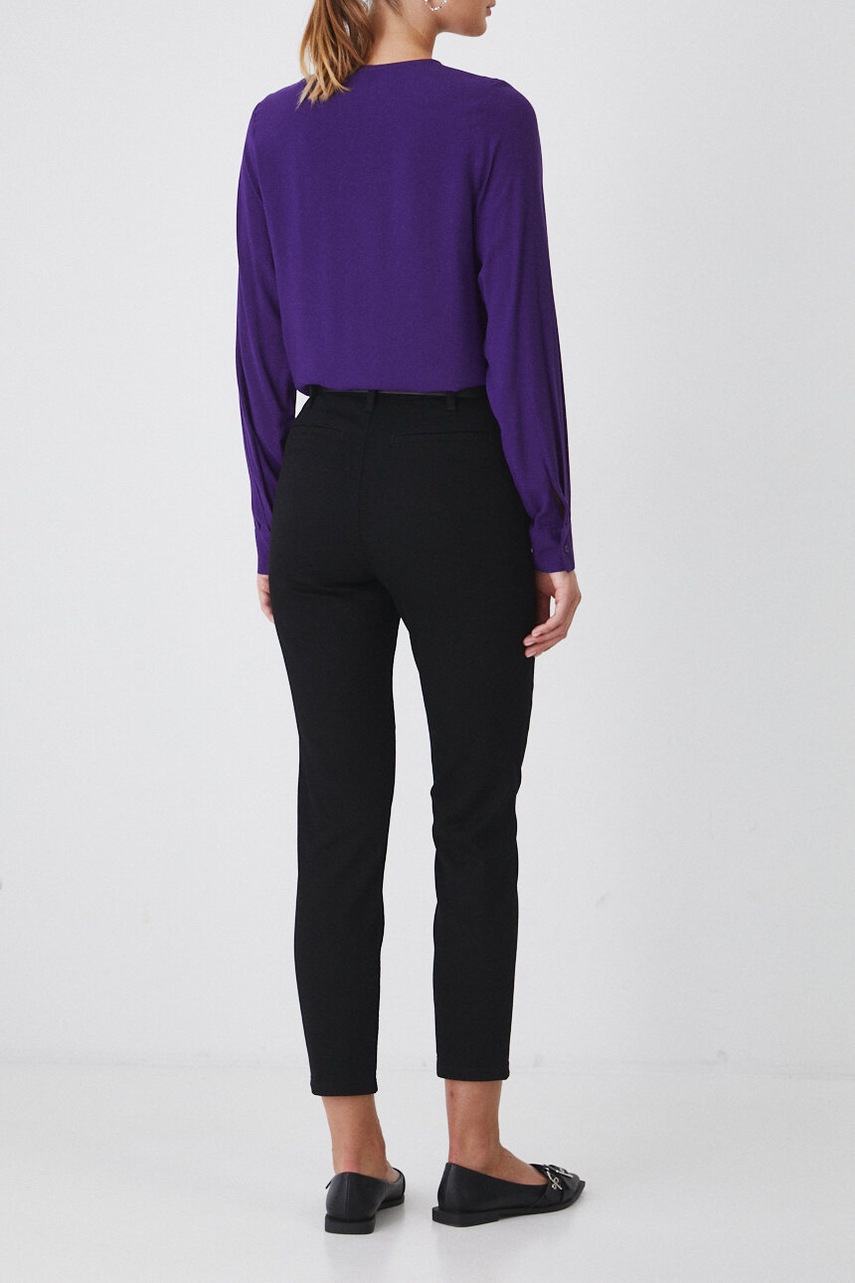 - Model z podwyższoną talią i zapięciem na guzik i suwak.