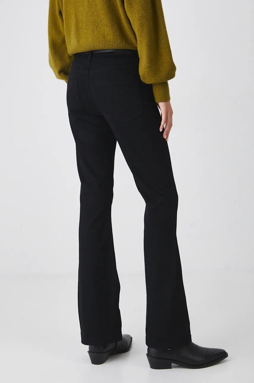 - Fason flare - jeansy dopasowane w okolicach talii oraz bioder. Wyróżnia je charakterystyczna nogawka, która rozszerza się stopniowo dopiero od okolic kolan. Krój tworzy efekt klepsydry i równoważy proporcje sylwetki.