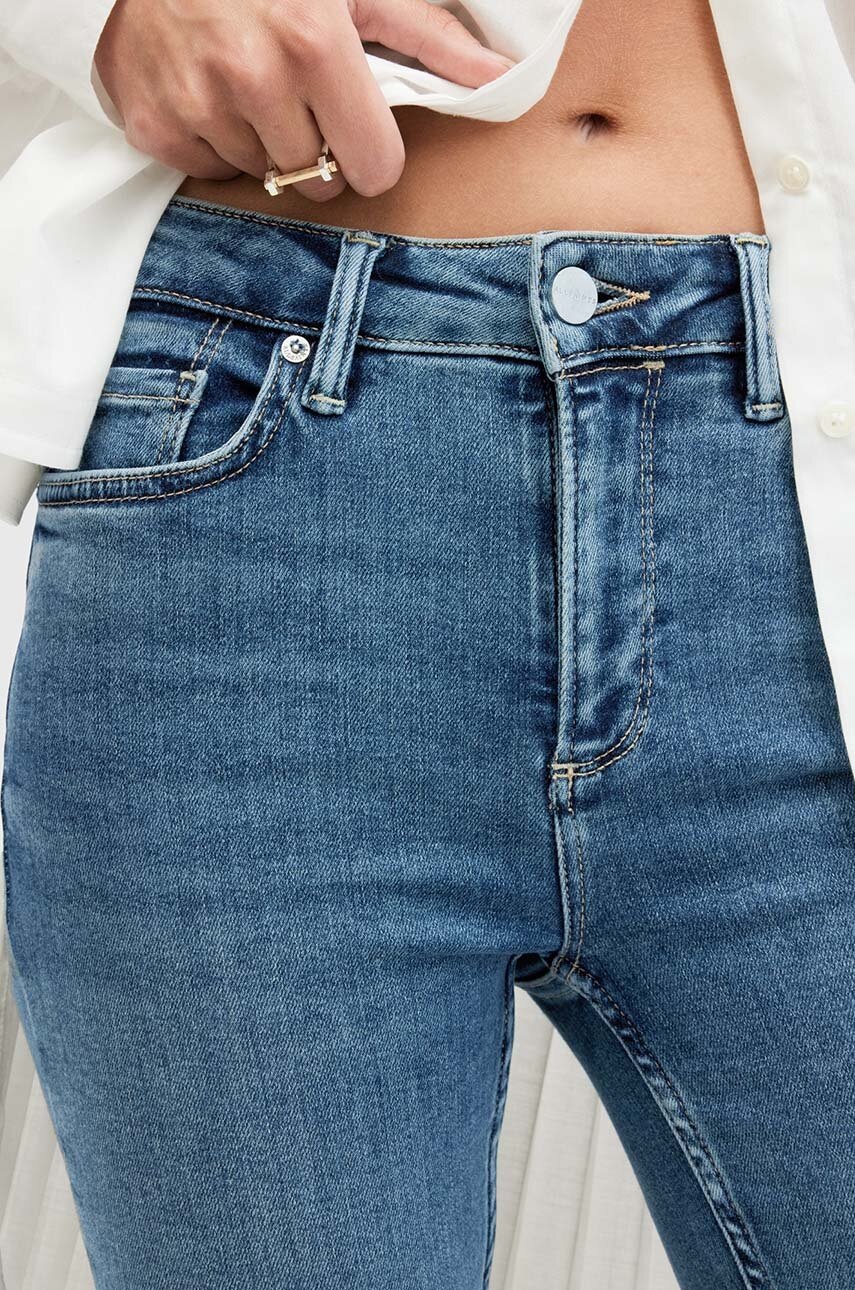 - Model z podwyższoną talią i zapięciem na guzik i suwak.