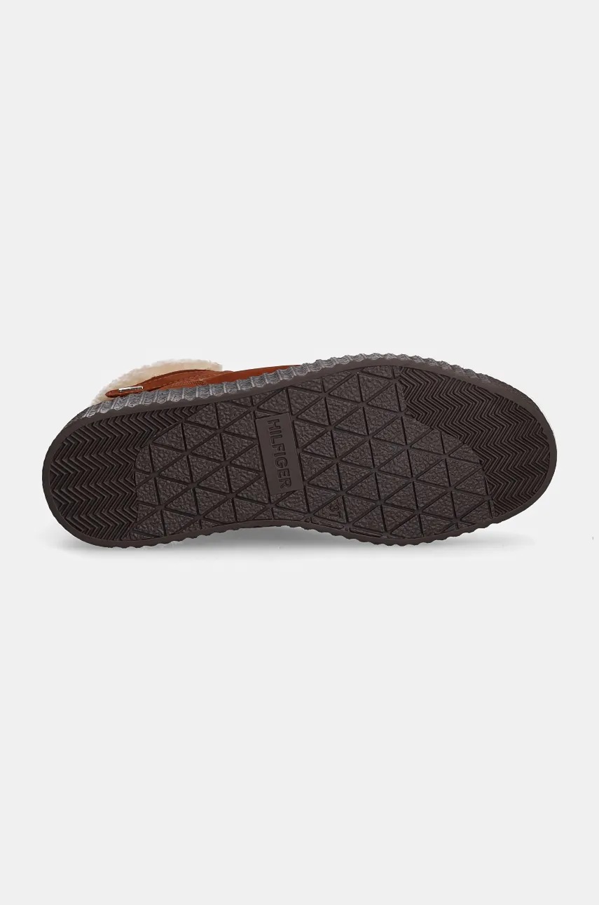 Tommy Hilfiger botki zamszowe FAUX FUR NUBUCK LOW LACE-UP kolor brązowy na płaskim obcasie ocieplone FW0FW08172