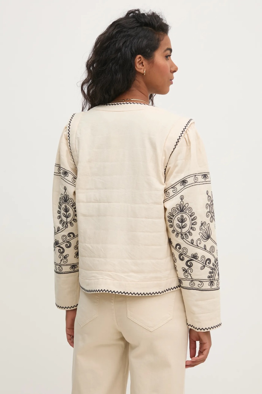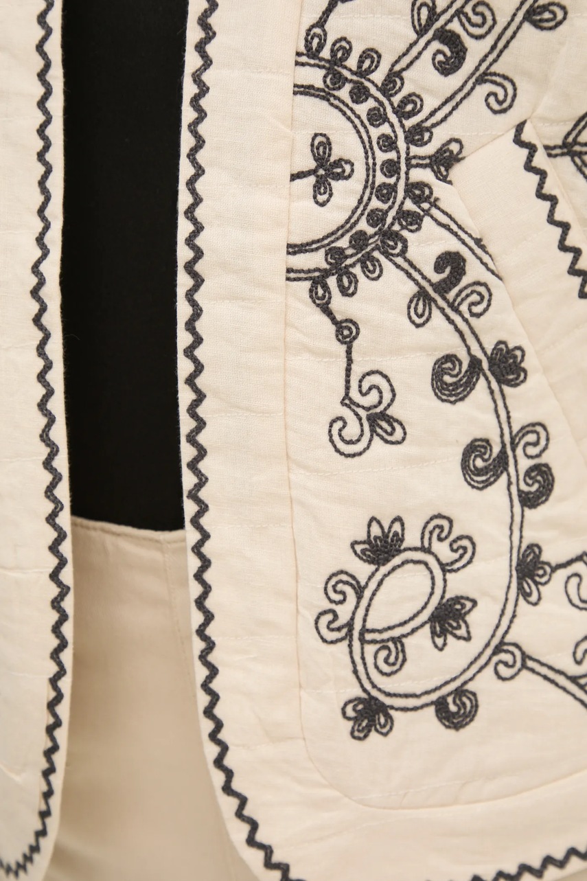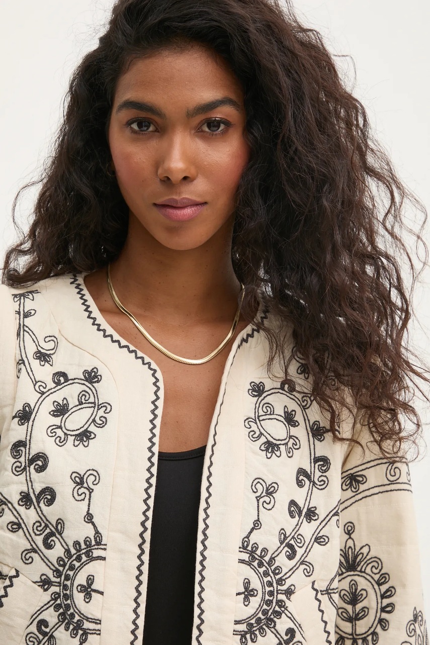 - Model z ozdobnymi haftami.