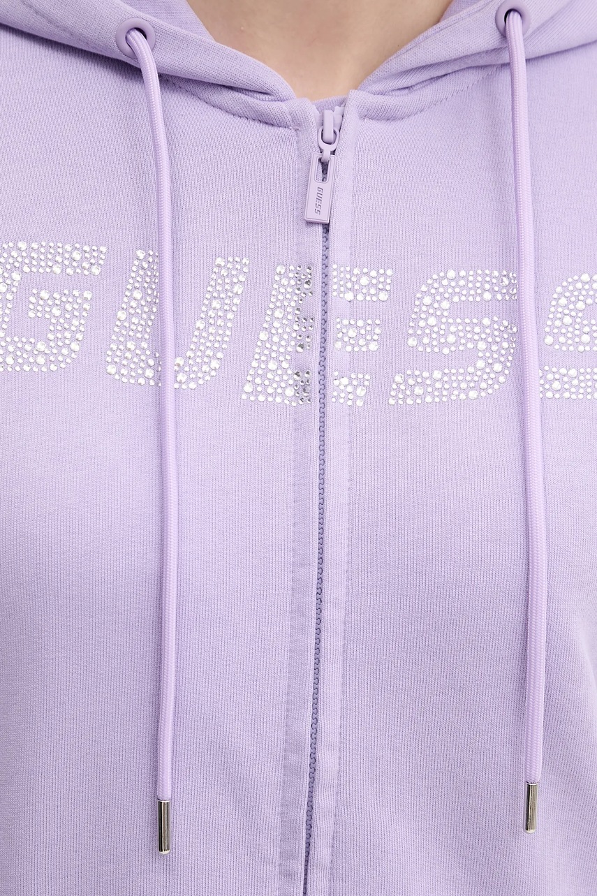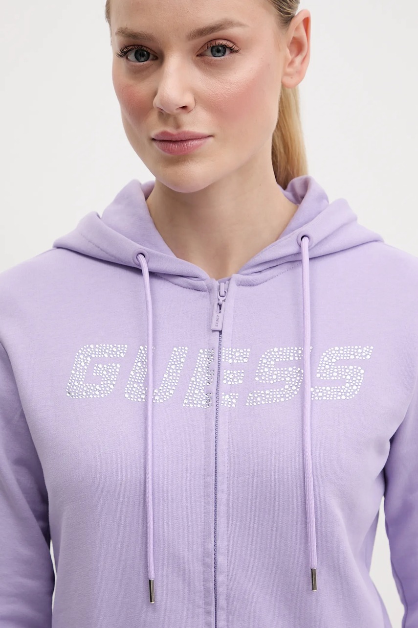 Guess bluza bawełniana PRIMULA damska kolor fioletowy z kapturem z aplikacją V5GQ10 KCRP0