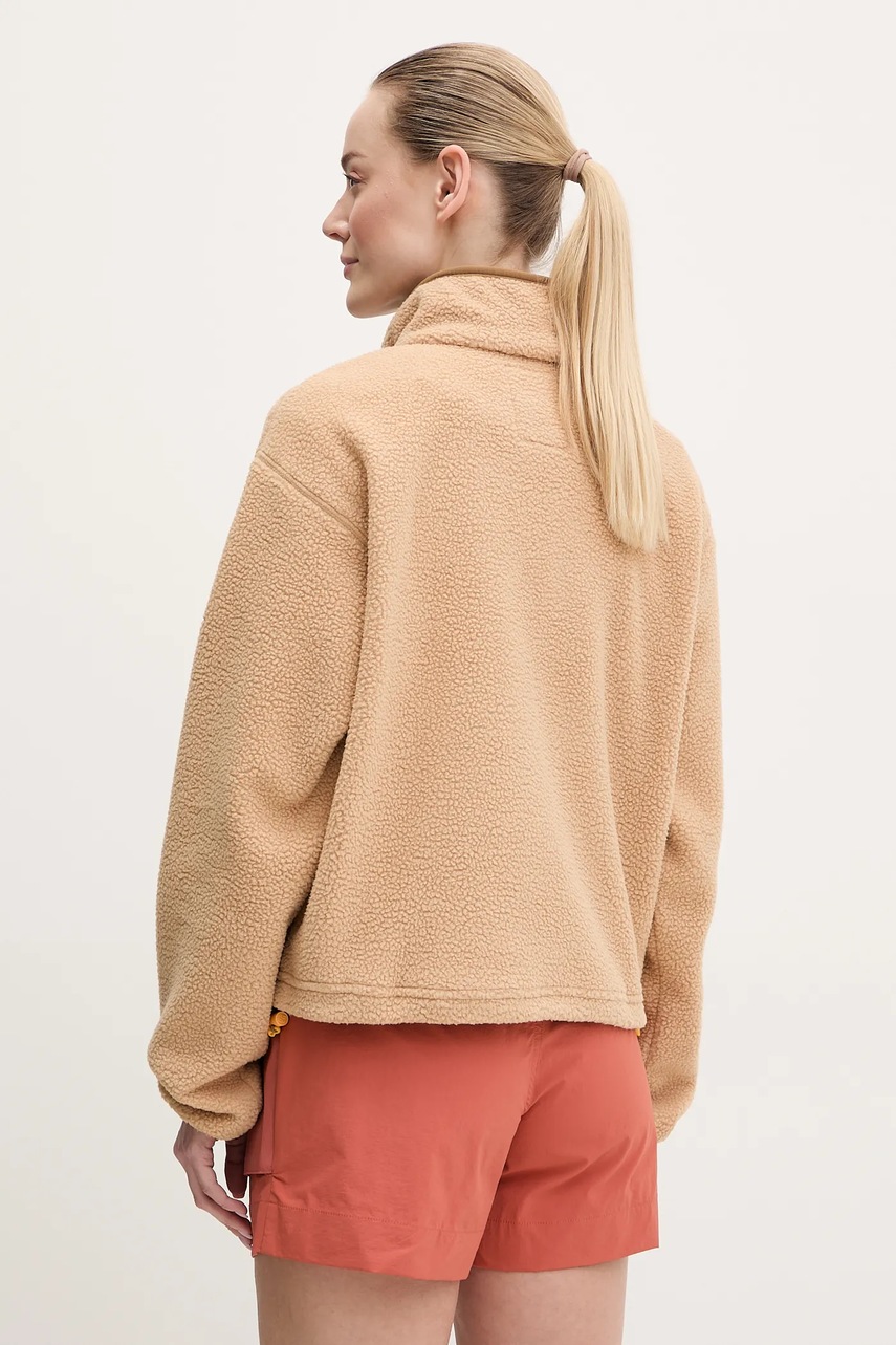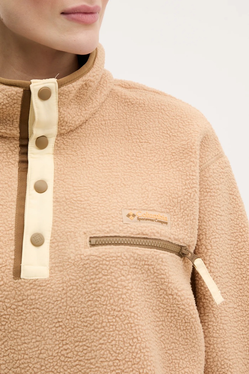 Najważniejsze cechy damskiej bluzy polarowej ColumbiaMateriał typu sherpa oraz polar gwarantuje wysoką izolację cieplną i skuteczną ochronę przed chłodem w chłodniejsze dniModel dedykowany do codziennej aktywności świetnie sprawdza się podczas spacerów, wyjść na miasto czy weekendowego wypoczynkuLuźny, relaxed fit zapewnia maksymalną swobodę ruchów i komfort nawet przy wielowarstwowym ubiorzeSportowy, casualowy styl umożliwia łatwe dopasowanie bluzy do miejskich i swobodnych stylizacjiBluza bez kaptura z klasycznym dekoltem i zapięciem na zatrzask łączy funkcjonalność z minimalistycznym wyglądemJednolity, gładki polar sherpa charakteryzuje się przyjemną w dotyku, miękką i grubą strukturą, która dobrze utrzymuje ciepłoKieszeń na piersi pozwala na wygodne przechowanie drobiazgów podczas codziennego użytkowaniaZapięcie główne na praktyczne zatrzaski ułatwia szybkie zakładanie i zdejmowanie bluzyDół bluzy wyposażony w regulację umożliwia indywidualne dopasowanie do sylwetki oraz ochronę przed wiatremDługie, szerokie i luźno opadające rękawy zapewniają komfort oraz modny, swobodny wyglądDługość: 59 cm. Szerokość pod pachami: 58 cm. Wymiary podane dla rozmiaru: S.