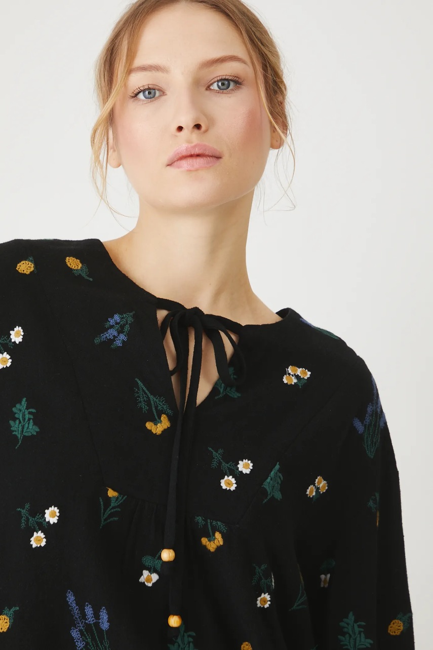 - Model z ozdobnymi haftami.