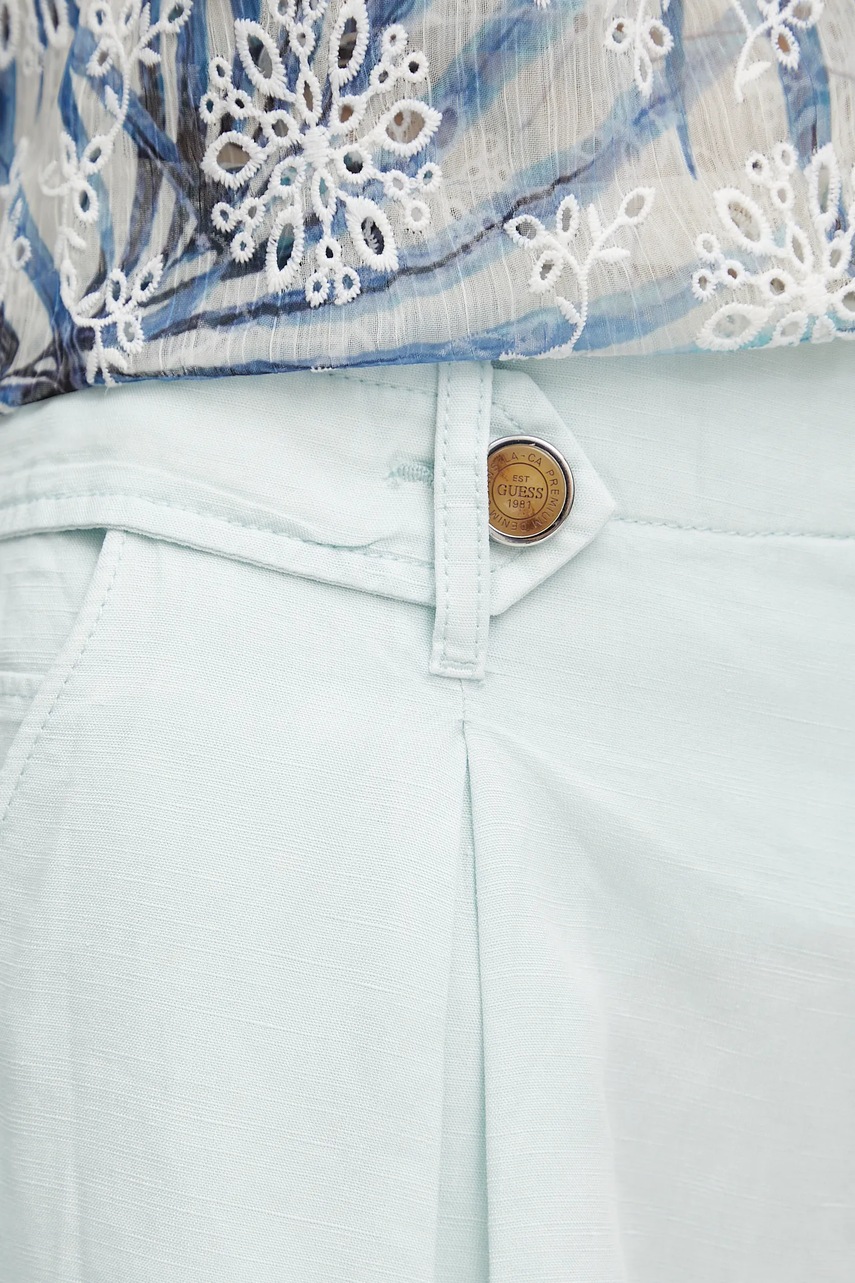 Guess szorty z domieszką lnu SHAYE damskie kolor turkusowy gładkie high waist W5GD1J WG8N0