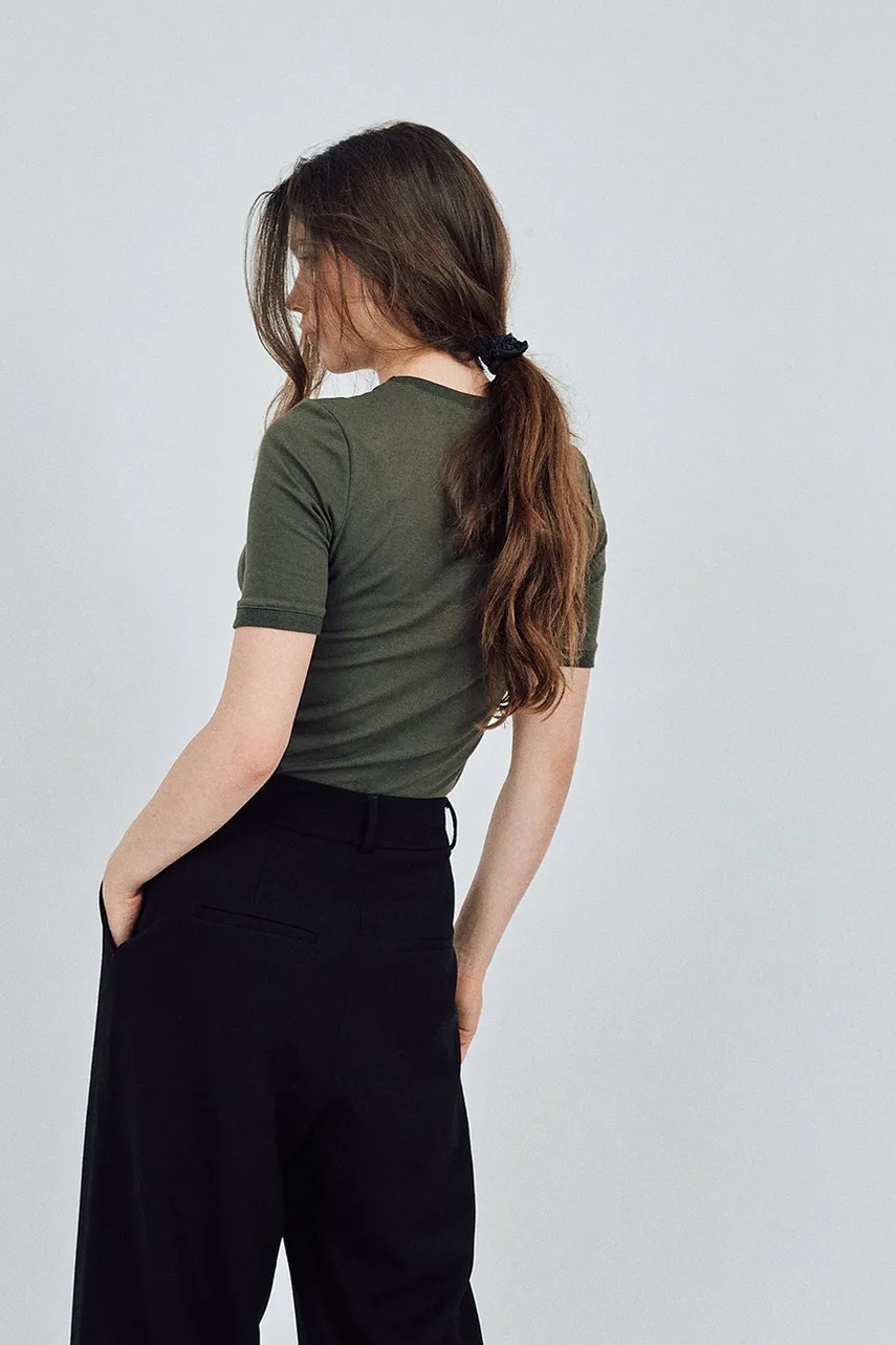 - Okrągły, prążkowany dekolt.