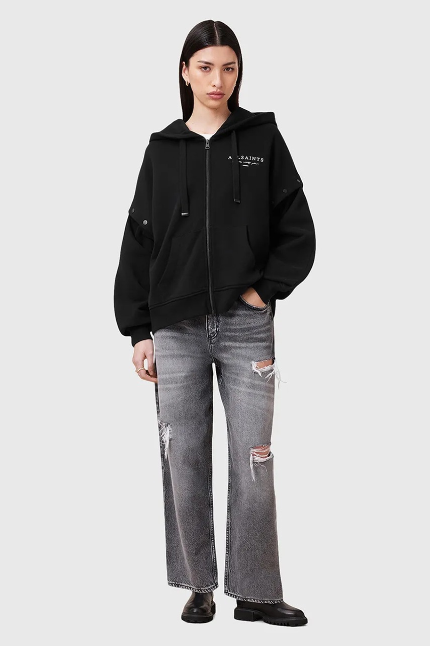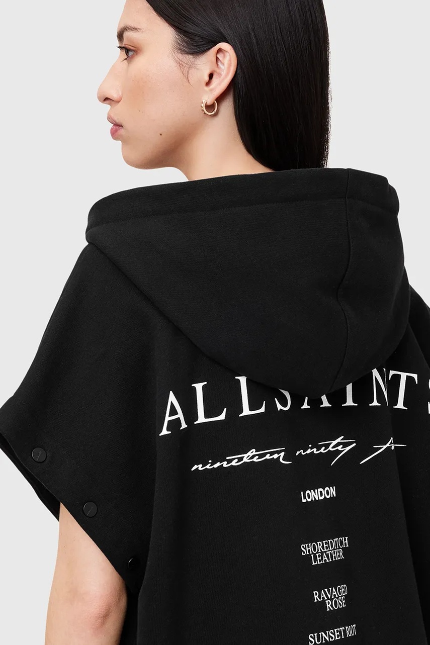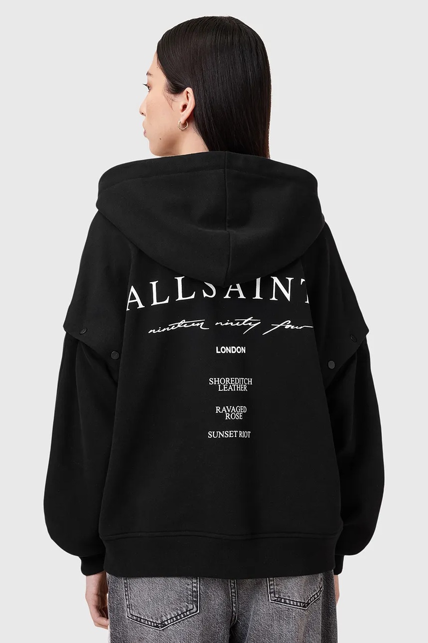 AllSaints bluza bawełniana AROMA damska kolor czarny z kapturem z nadrukiem W134JC