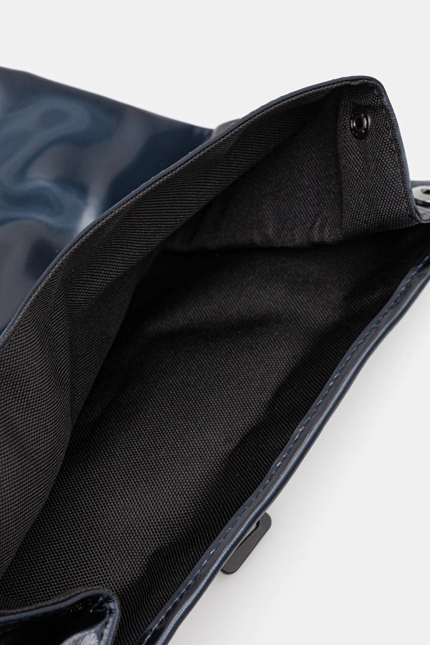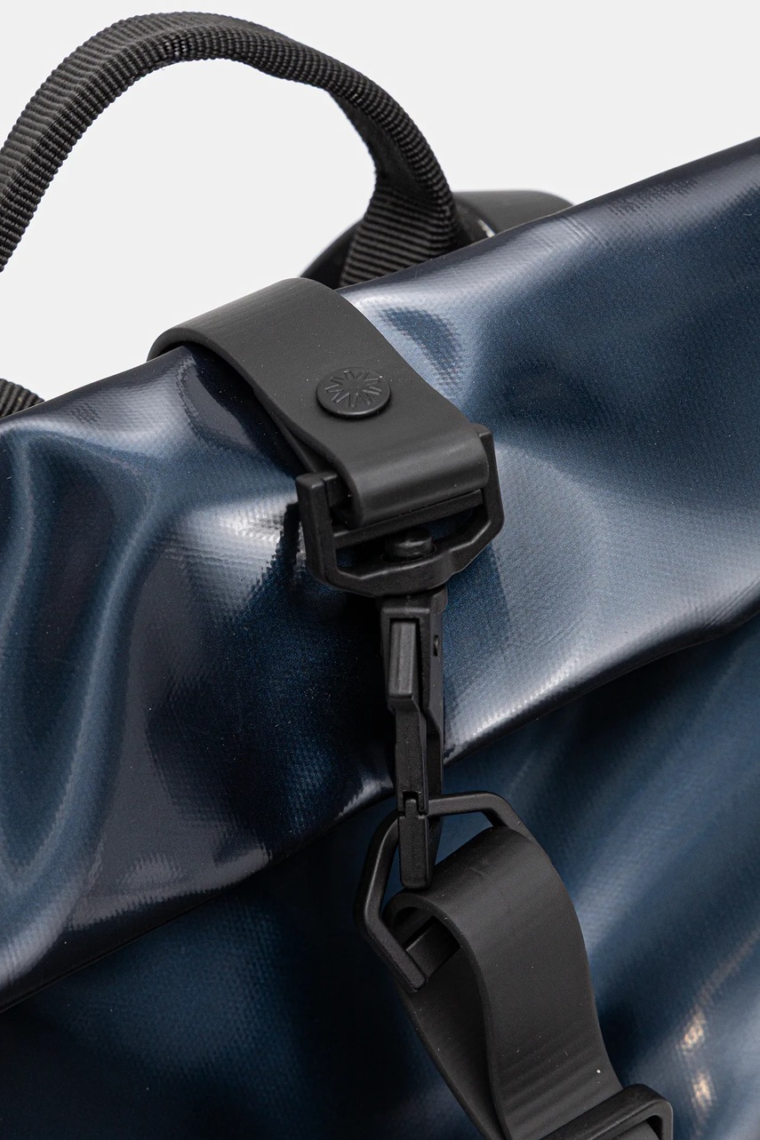 - Rolowana górna krawędź z zapięciem na karabińczyk maksymalizuje przestrzeń do przechowywania.