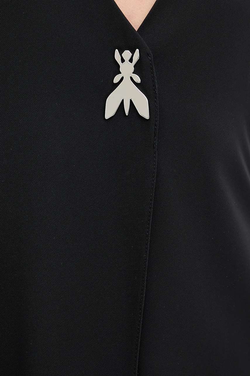 Charakterystyczne cechy damskiej bluzki tekstylnej Patrizia Pepe z ozdobnymi wycięciamiSlimowany fason subtelnie modeluje sylwetkę i gwarantuje nowoczesną elegancję na każdą wyjątkową okazjęElegancki typ bluzki z głębokim dekoltem V pozwala na stworzenie szykownej stylizacji z biżuterią lub szlachetnymi dodatkamiPrzewiewny materiał tekstylny z 5% dodatkiem elastanu zapewnia komfort noszenia i elastyczność nawet podczas wielogodzinnych uroczystościModel idealny na formalne wydarzenia oraz wieczorne wyjścia, doskonale współgrający z eleganckimi spodniami czy spódnicąSleeveless design z odkrytymi plecami nadaje sylwetce lekkości i stylowego charakteru podczas cieplejszych dniWyrazisty dekolt w serek optycznie wysmukla szyję i podkreśla kobiece atutyGładka i jednolita struktura tkaniny pozwala na łatwe komponowanie bluzki z kontrastowymi dodatkami i wzorzystymi akcesoriamiPrzedłużona długość do kostki efektownie prezentuje się podczas ruchu, dodając sylwetce elegancjiPraktyczne zapięcie na zatrzask gwarantuje szybkie i wygodne zakładanie oraz bezpieczne dopasowanieOzdobne wycięcia stanowią designerski akcent, przyciągający uwagę i podkreślający unikatowy charakter bluzkiModel Go Green wykonany z przeważającej części poliestru, co wspiera zrównoważoną modę i dbałość o środowiskoDługość bluzki z przodu i z tyłu: 145 cm. Szerokość pod pachami: 44 cm. Wymiary dotyczą rozmiaru 36.Dostępne rozmiary są przeliczone z włoskiej rozmiarówki producenta na standardową rozmiarówkę europejską. Zamawiany rozmiar może różnić się od widocznego na metce (IT 38/XXS = EU XS). Dla pewności prosimy o zapoznanie się z tabelą rozmiarową.