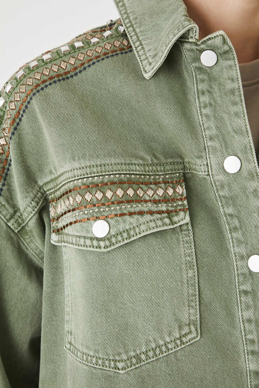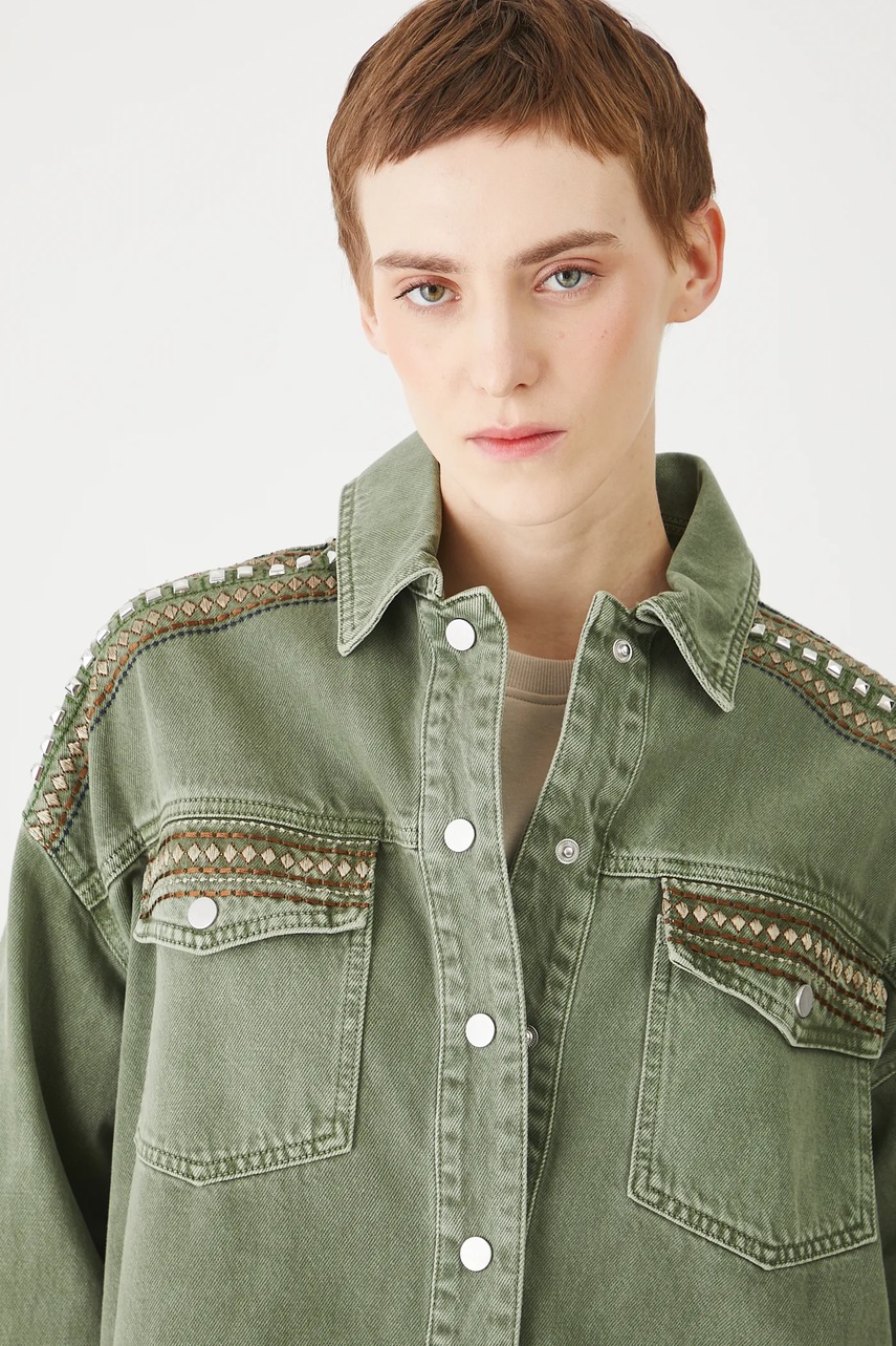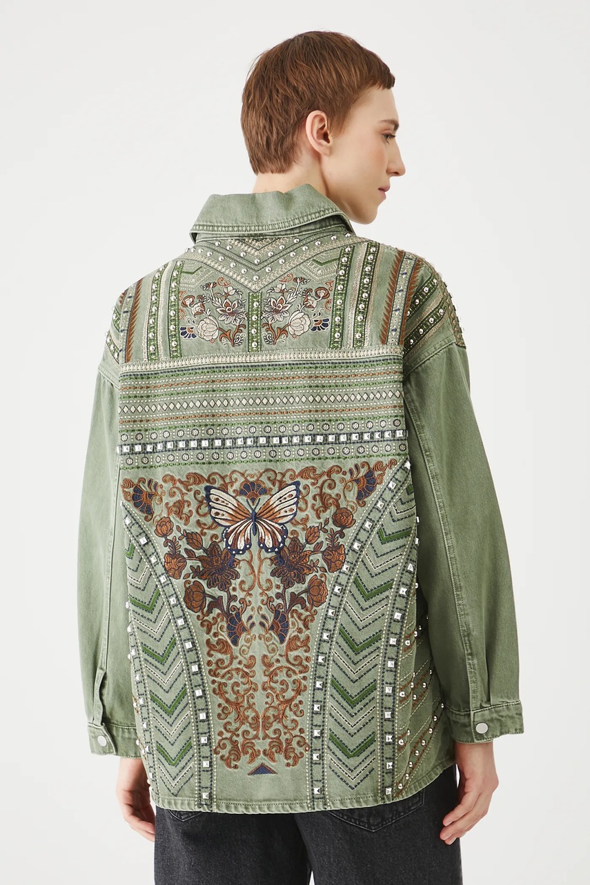 - Model z ozdobnymi haftami.