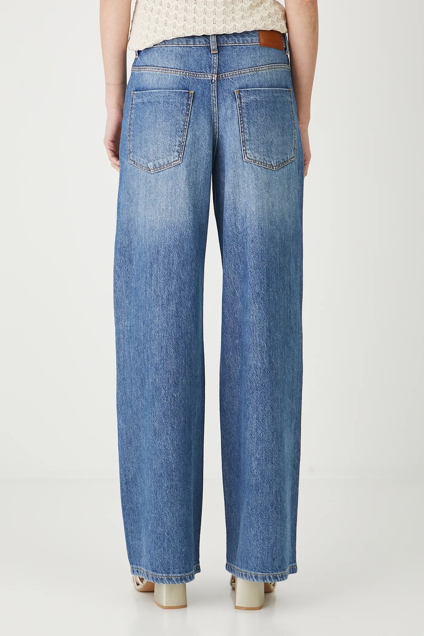 - Fason wide leg - jeansy lekko dopasowane w okolicy bioder z charakterystyczną szeroką nogawką, która stopniowo poszerza się od talii, aż do samego dołu. Krój akcentuje wcięcie w talii, a luźny dół nie krępuje ruchów.