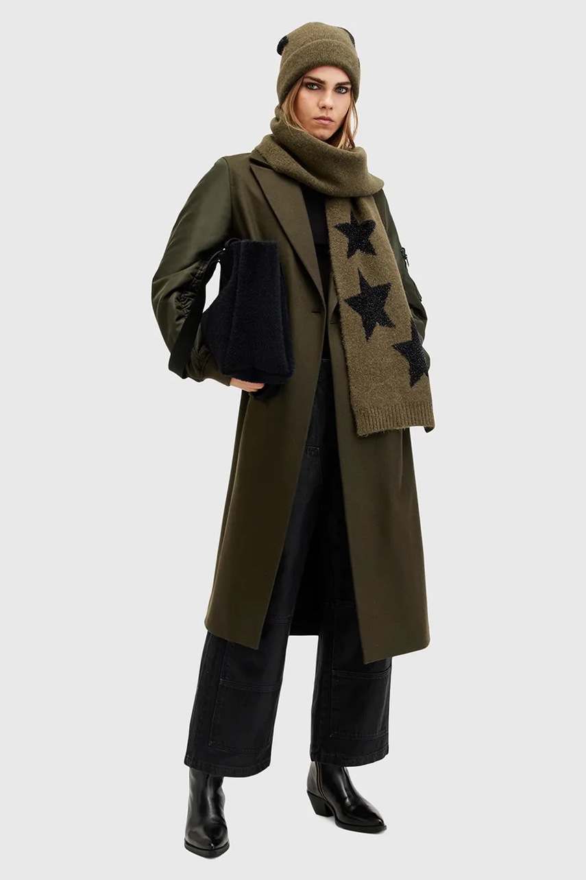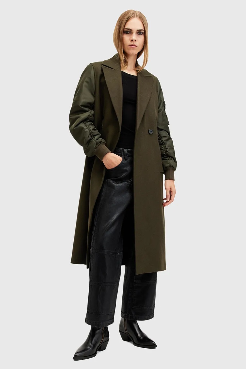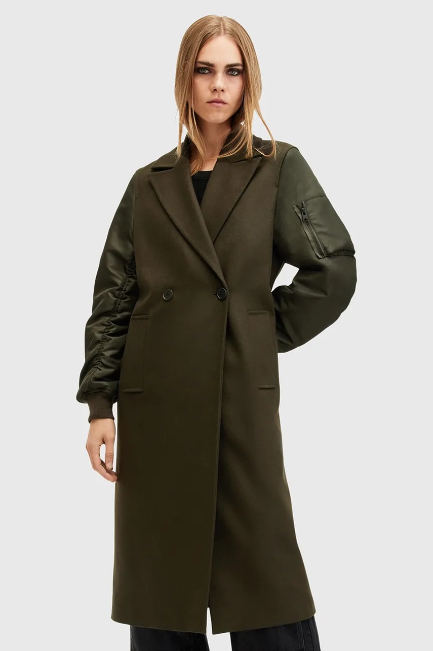 AllSaints płaszcz z wełną PAULAH kolor zielony przejściowy dwurzędowy W007OZ