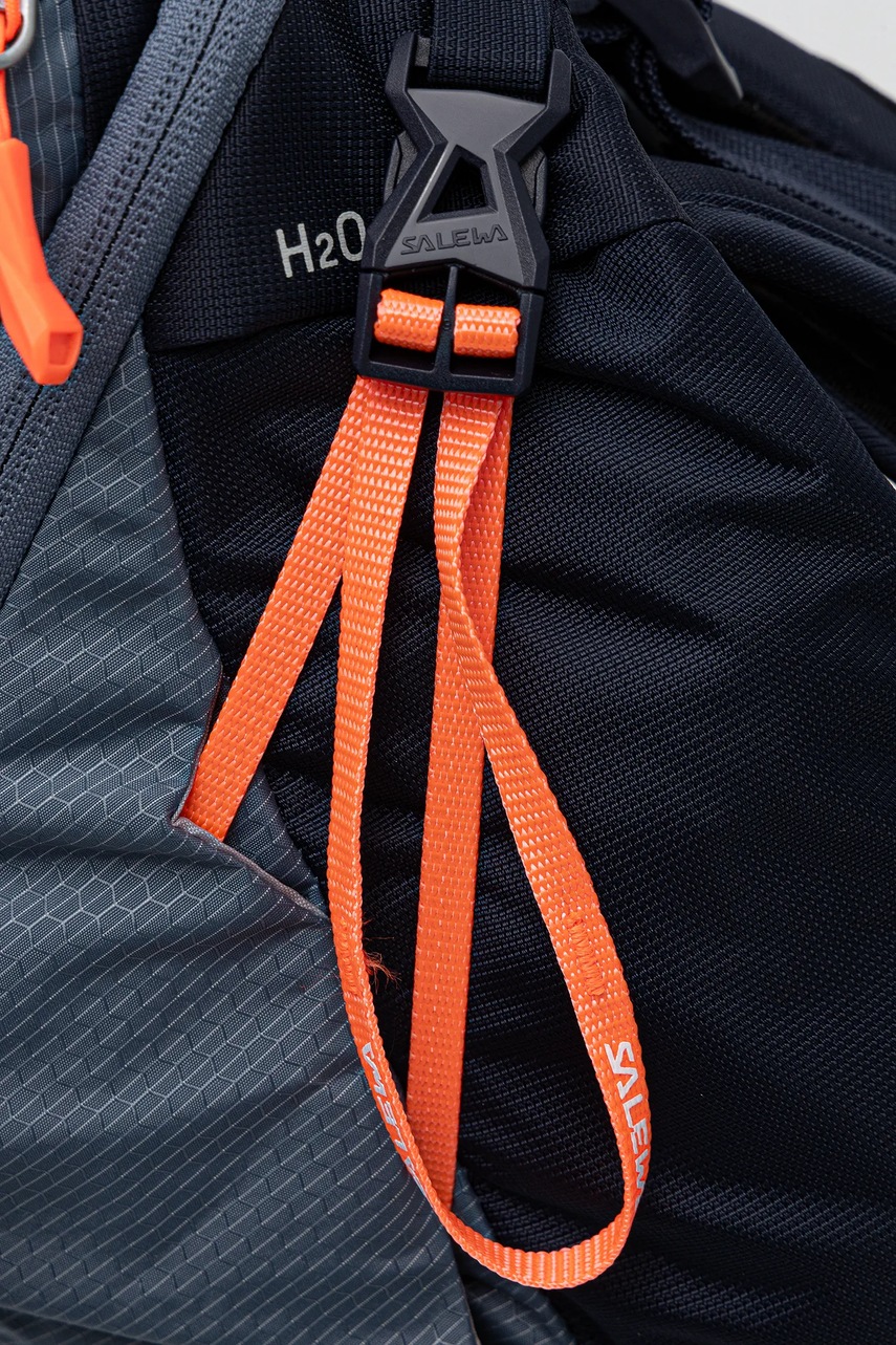 - Plecak kompatybilny z systemem nawadniania Salewa. Pozwala na wyprowadzenie rurki z ustnikiem na zewnątrz i jej zaczepienie przy szelce.