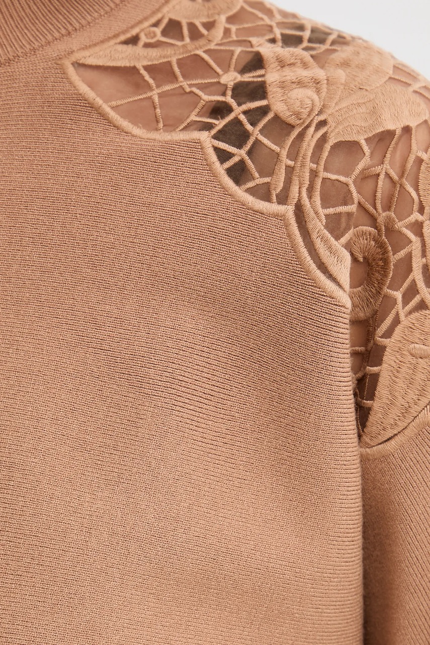 - Model z ozdobnymi haftami.