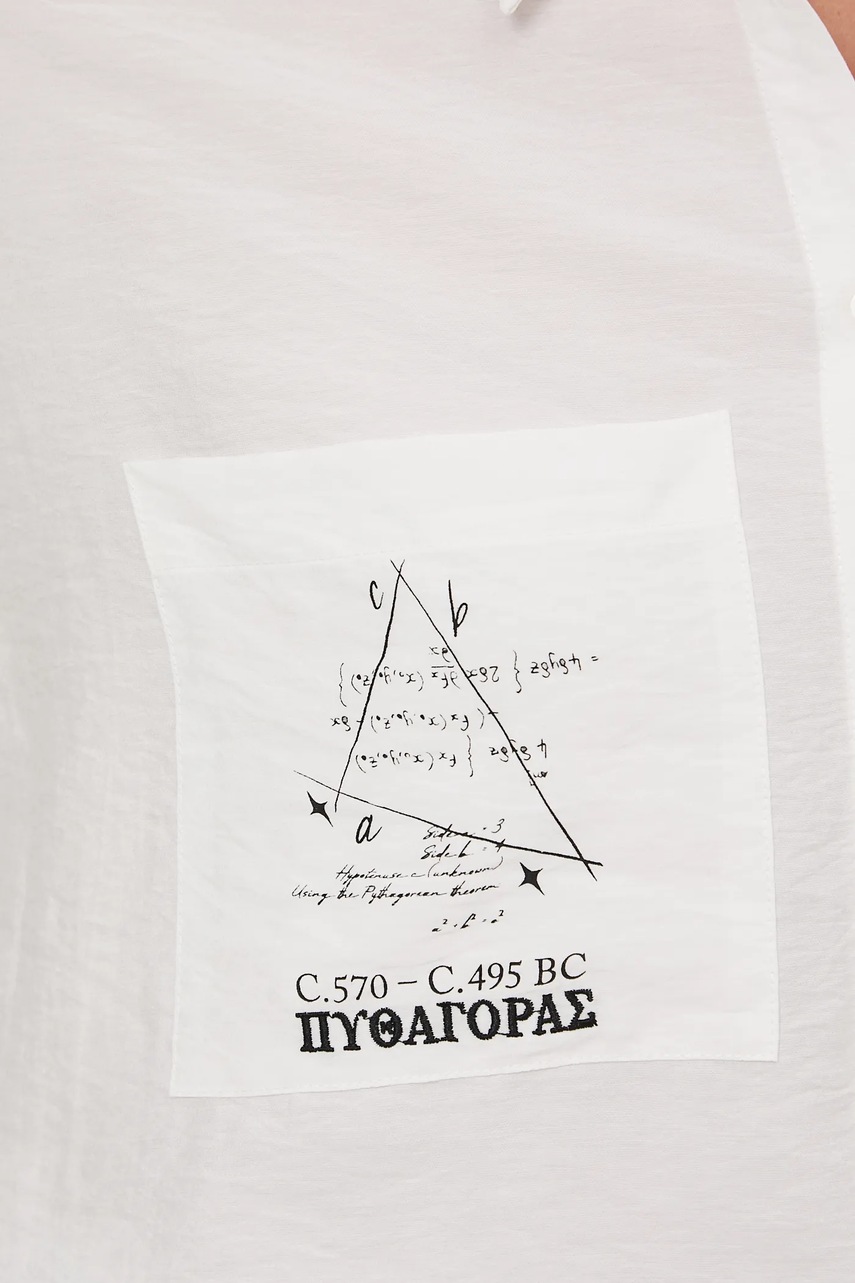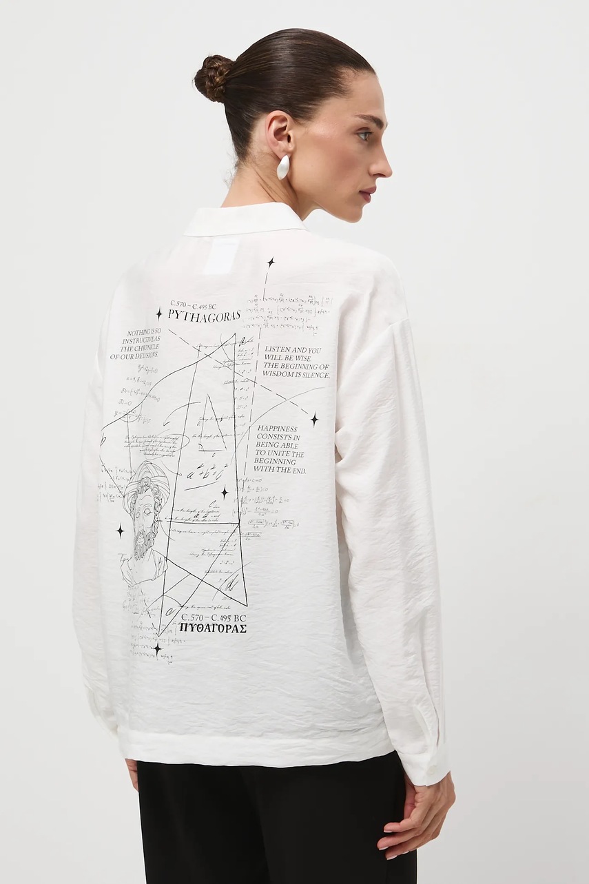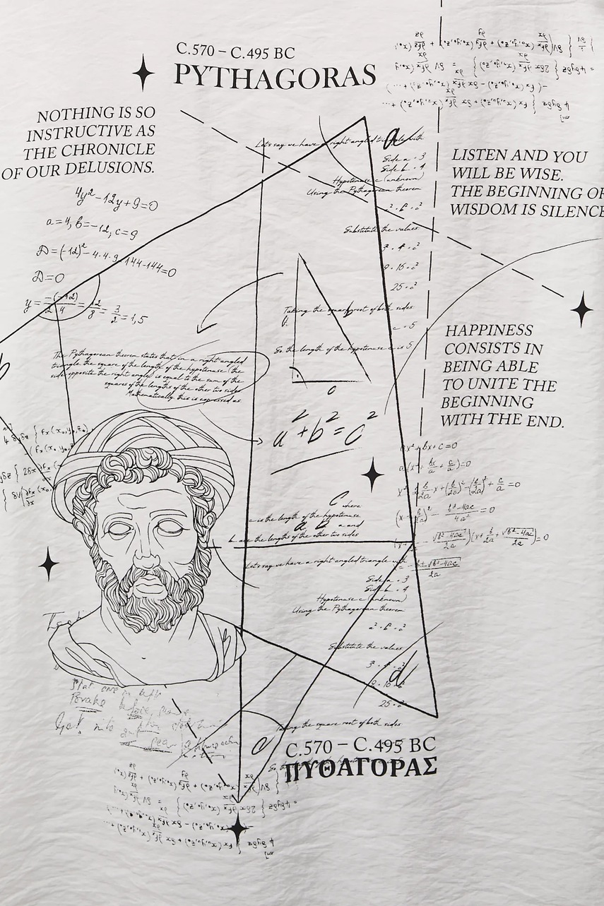 W świecie, gdzie trendy nieustannie się zmieniają, nowa odsłona kolekcji Science - Words of Wisdom zatrzymuje czas i sięga do źródeł ponadczasowej mądrości. Zestawia antyczne przesłania z nowoczesną formą, a pytania sprzed wieków z ich współczesnym wydźwiękiem. Na T-shirtach, bluzach i koszulach znalazły się sentencje największych myślicieli: Sokratesa, Platona, Arystotelesa, Pitagorasa czy Heraklita - słowa, które przetrwały tysiąclecia i wciąż pozostają aktualne. Cytaty filozofów nie muszą walczyć o uwagę, a printy nie konkurują z przesłaniem. Przeciwnie - oddają mu przestrzeń lub pogłębiają przekaz, a stając się częścią dyskusji o życiu, prawdzie i pięknie, dają możliwość uzupełnienia chwili kontemplacji odpowiednią stylizacją i zamanifestowania własnych przekonań.Oryginalnym dodatkiem do produktów z kolekcji są dedykowane metki, na których znalazły się informacje o wielkich filozofach, naukowcach i myślicielach.Nadruk inspirowany postacią Pitagorasa - twórcy twierdzenia, które stanowi fundament geometrii.