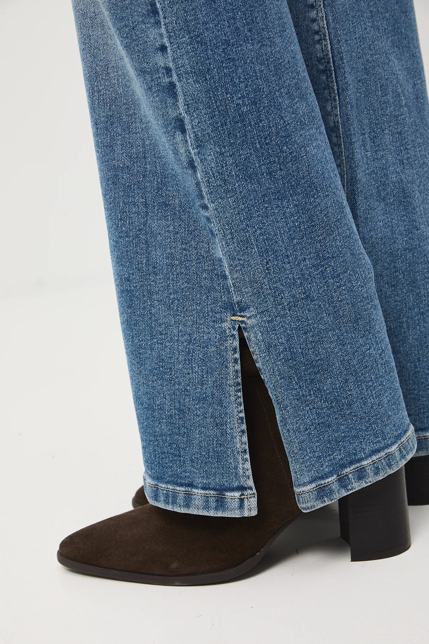 - Fason flare - jeansy dopasowane w okolicach talii oraz bioder. Wyróżnia je charakterystyczna nogawka, która rozszerza się stopniowo dopiero od okolic kolan. Krój tworzy efekt klepsydry i równoważy proporcje sylwetki.