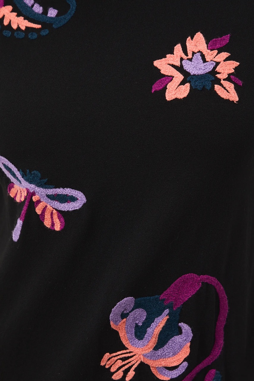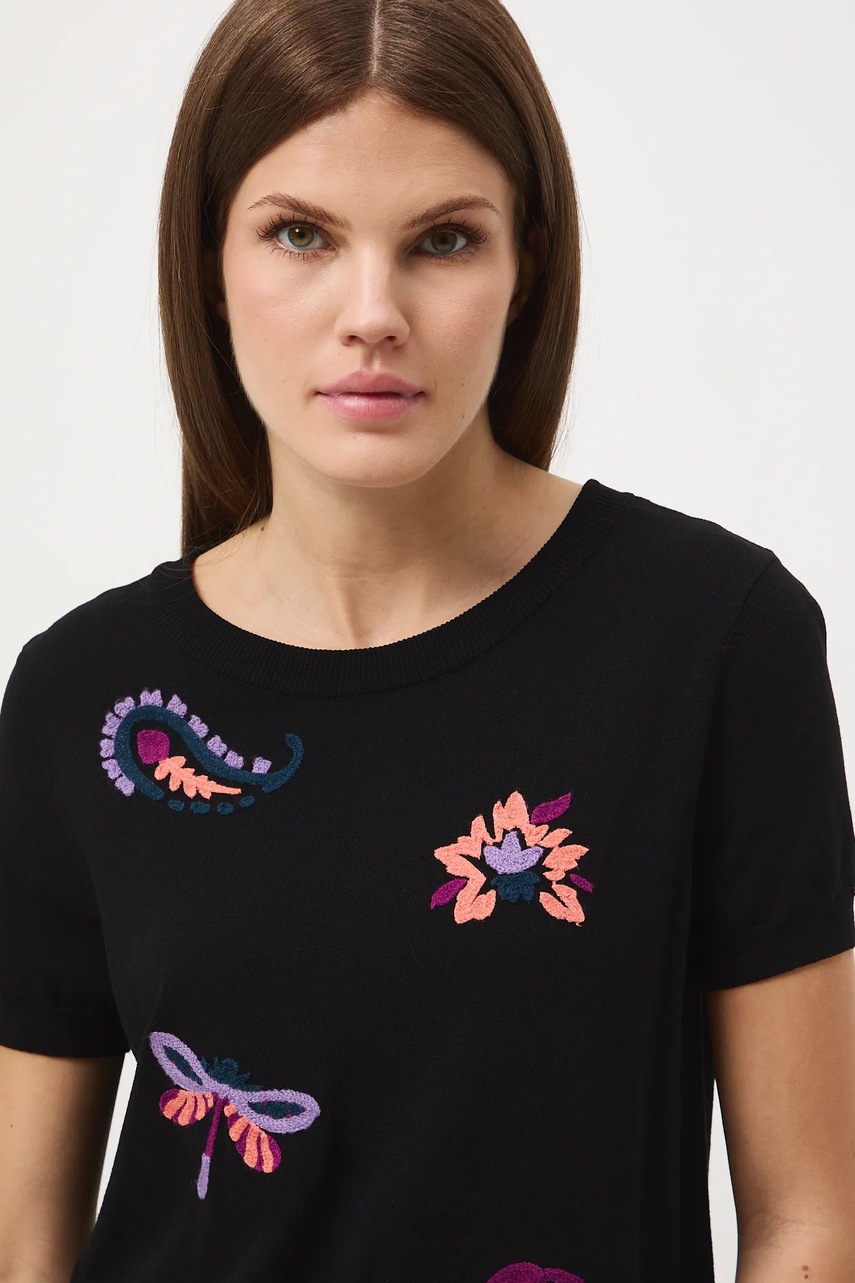 - Model z ozdobnymi haftami.