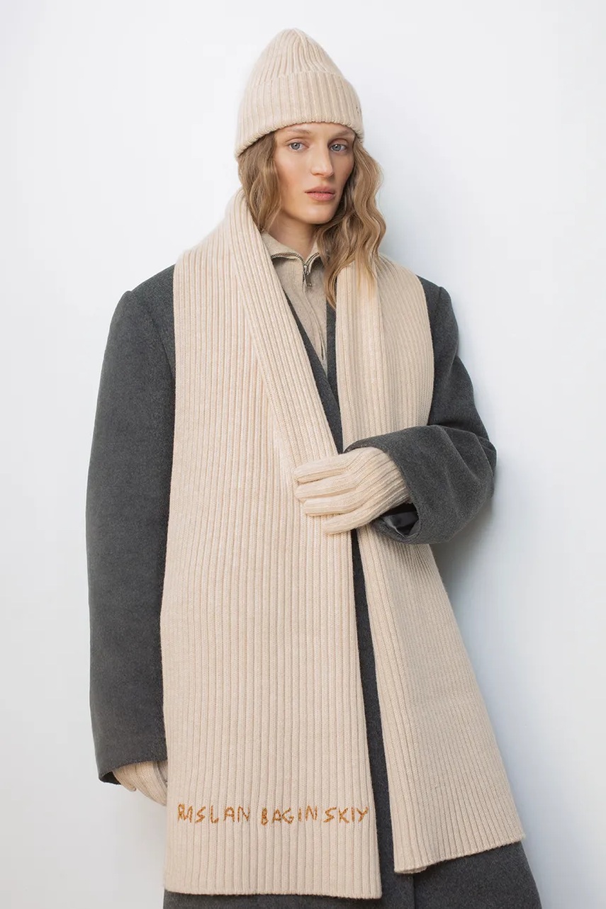 Ruslan Baginskiy szalik wełniany damski kolor beżowy z aplikacją SKR036-MW-FL-CD24
