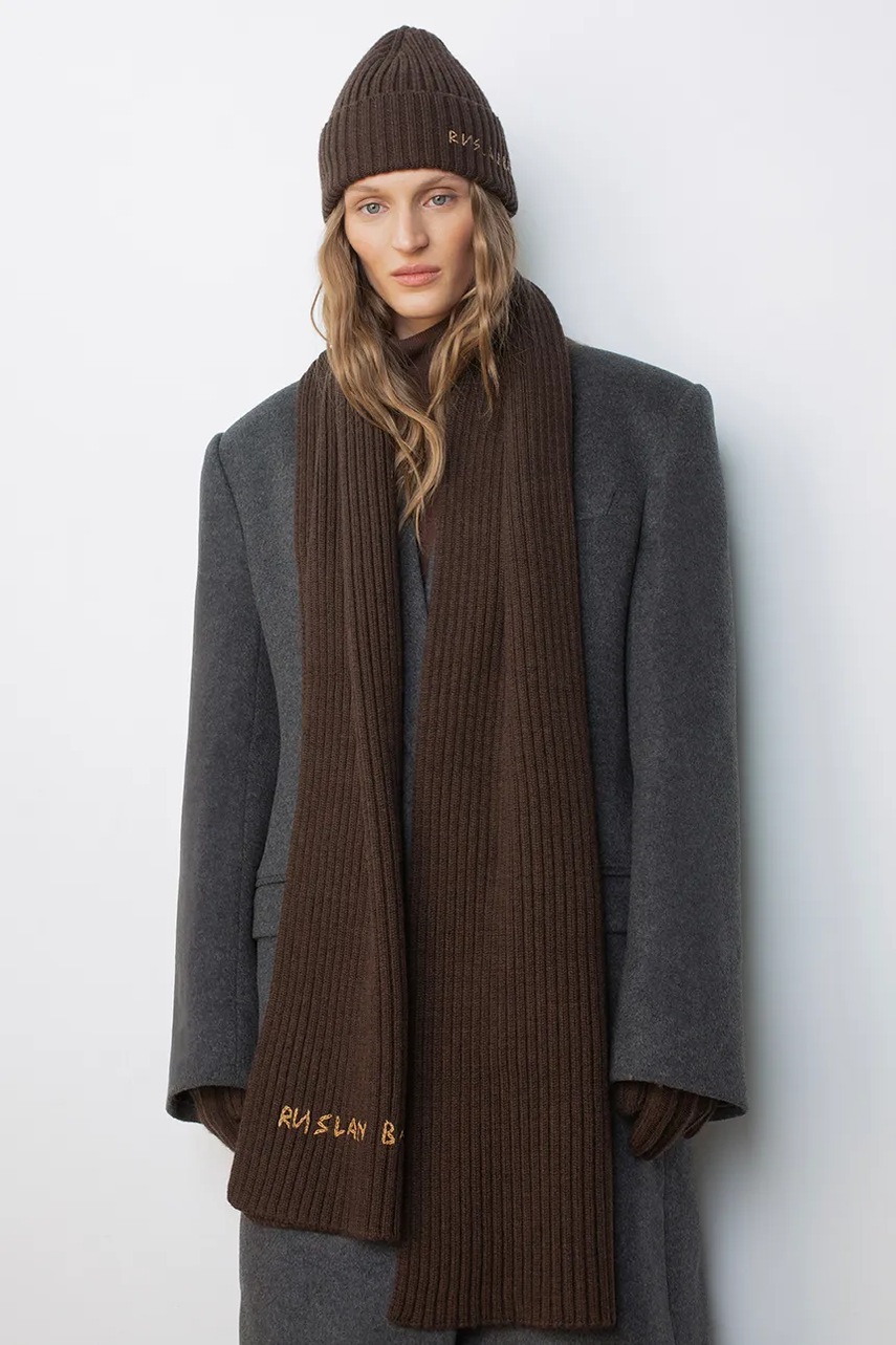 Ruslan Baginskiy szalik wełniany damski kolor brązowy z aplikacją SKR09/036-MW-FL-CD24
