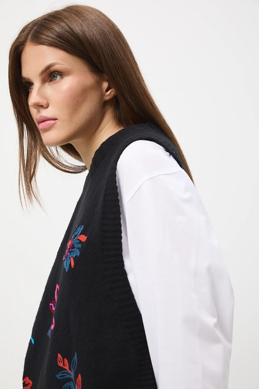 - Model z ozdobnymi haftami.