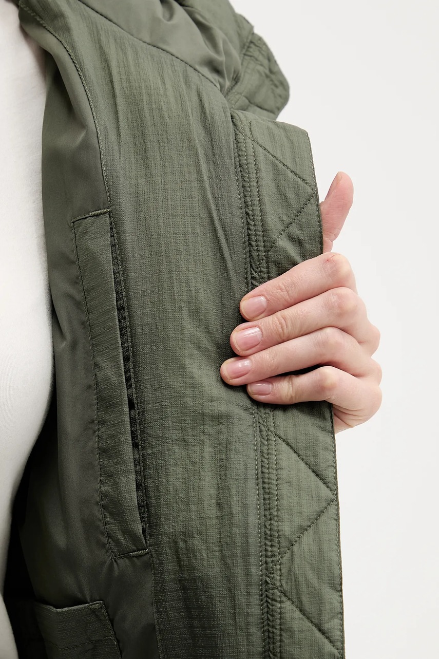 - Dolna krawędź wykończona troczkami ze stoperami, które dzięki możliwości regulacji obwodu dołu, zwiększają izolację od zimna.