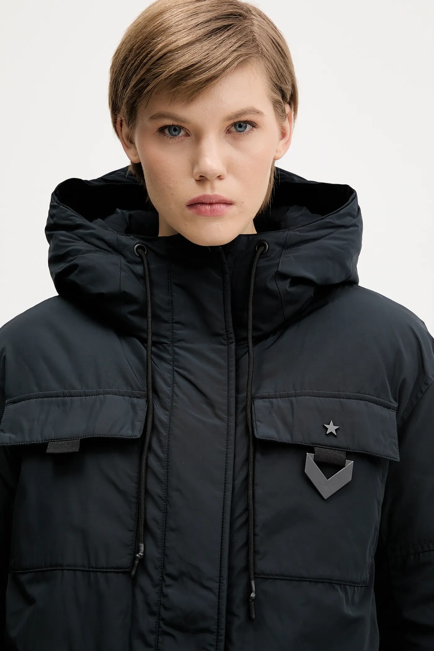 - Podwyższony kołnierz i nieodpinany kaptur gwarantują dodatkową ochronę przed chłodem.