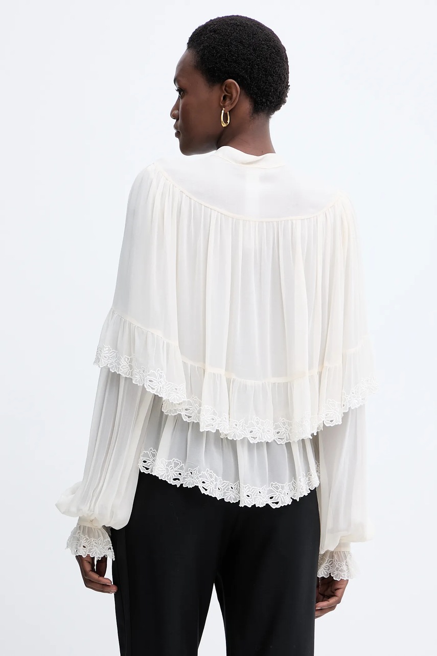 - Model z ozdobnymi haftami.