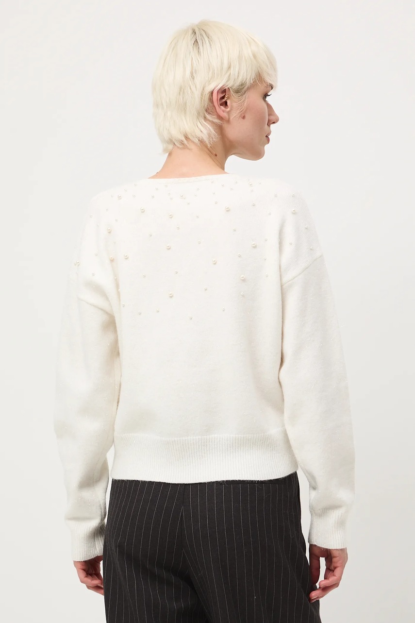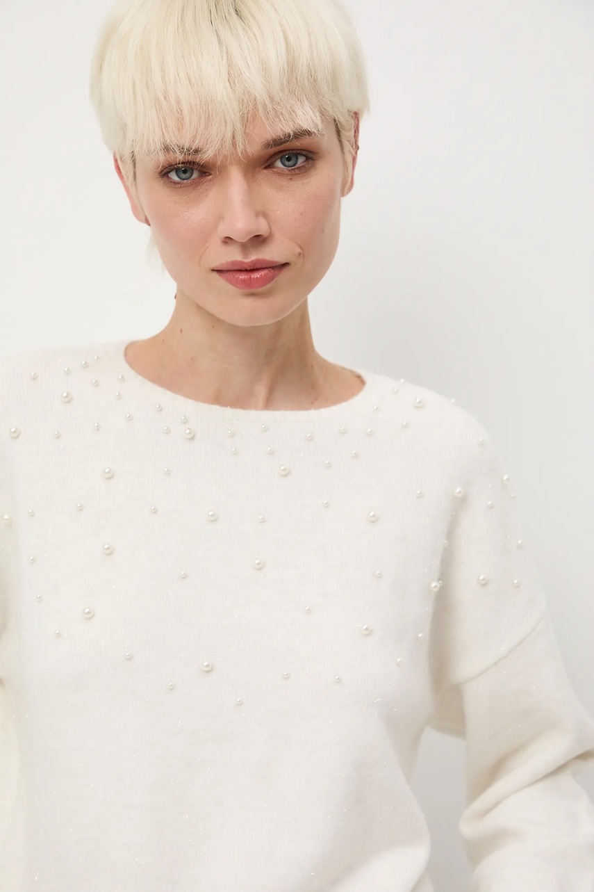- Model z ozdobną aplikacją z koralików imitujących perły.