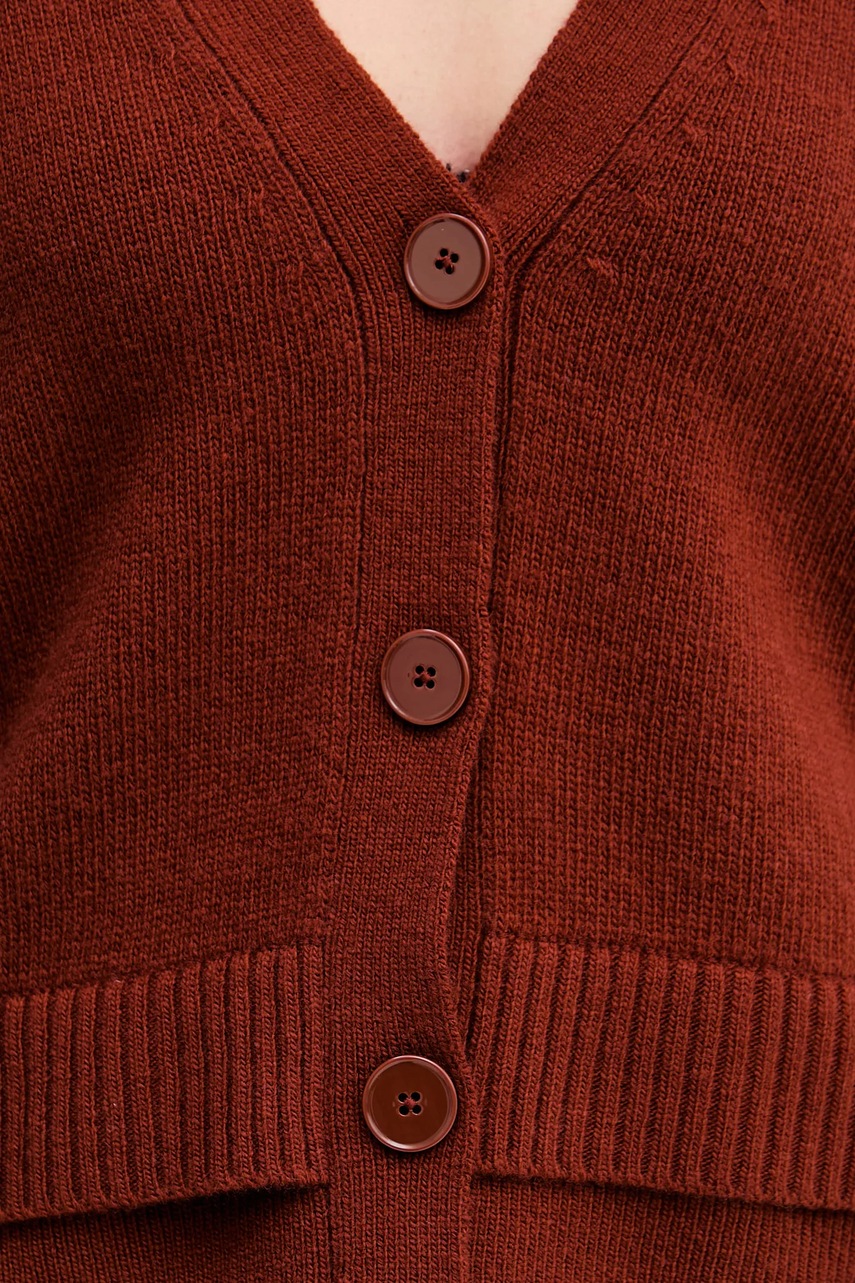 - Kardigan w fasonie regular zapewnia wygodę i uniwersalny wygląd. Delikatnie dopasowuje się do sylwetki, ale nie podkreśla jej nadmiernie. Klasyczny i prosty, sprawdzi się zarówno w eleganckich, jak i casualowych stylizacjach.