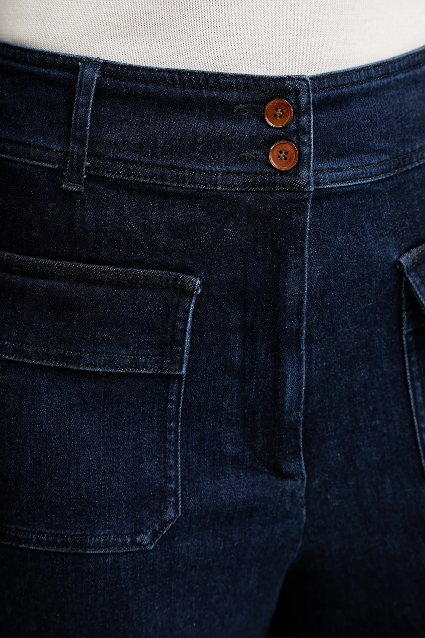 - Model z podwyższoną talią i zapięciem na suwak i guziki.