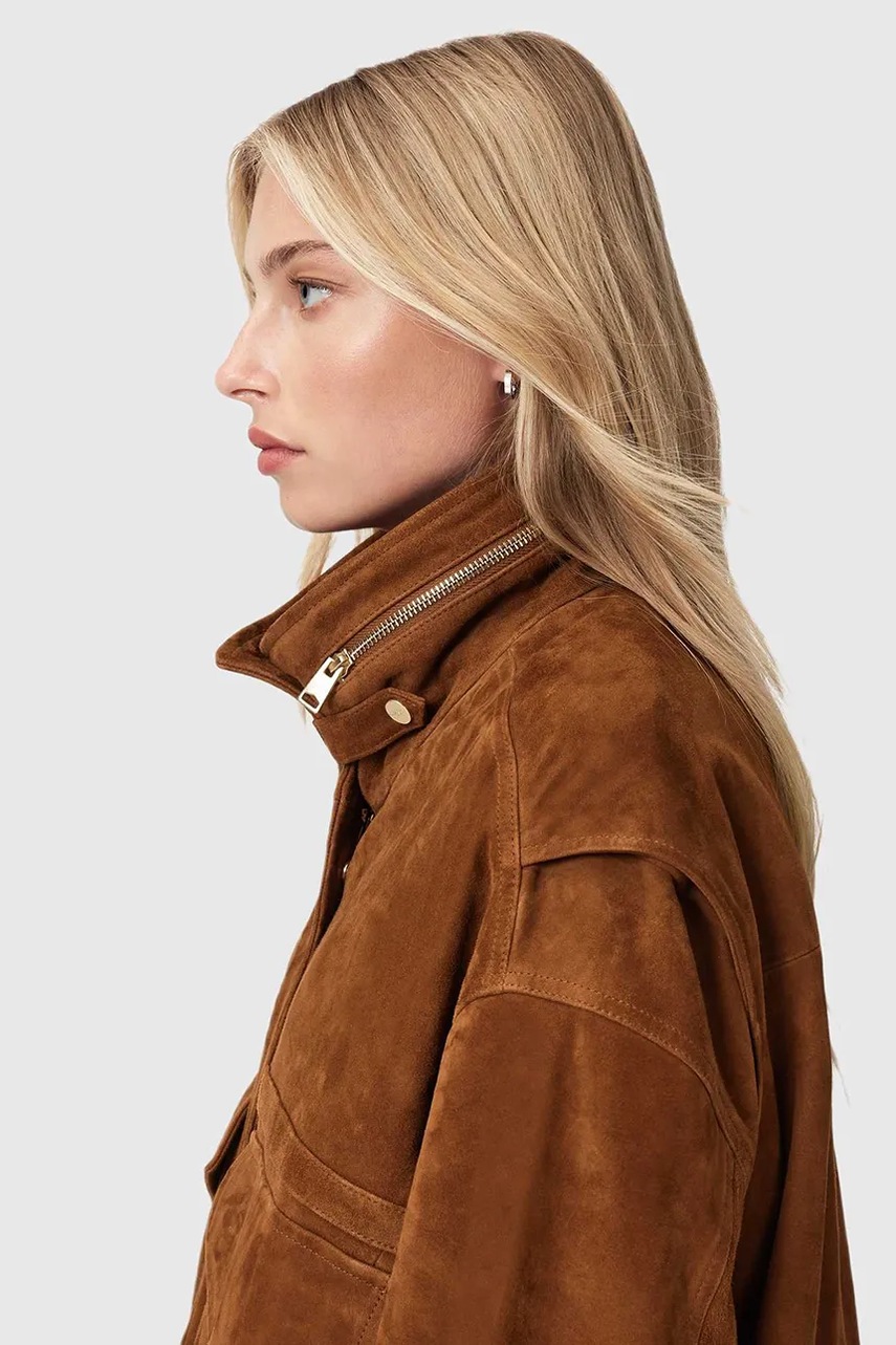 AllSaints kurtka zamszowa kolor brązowy przejściowa W087LD