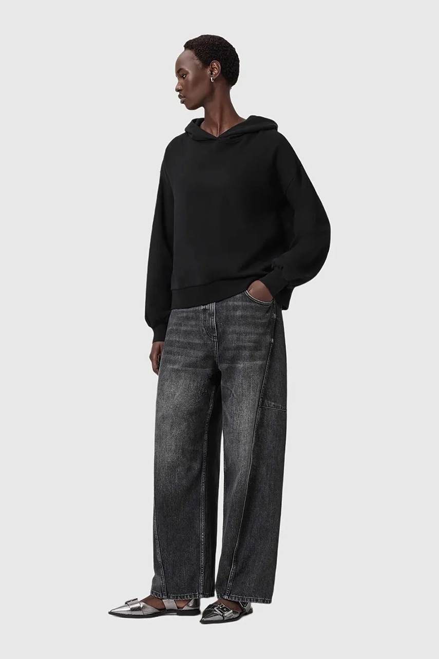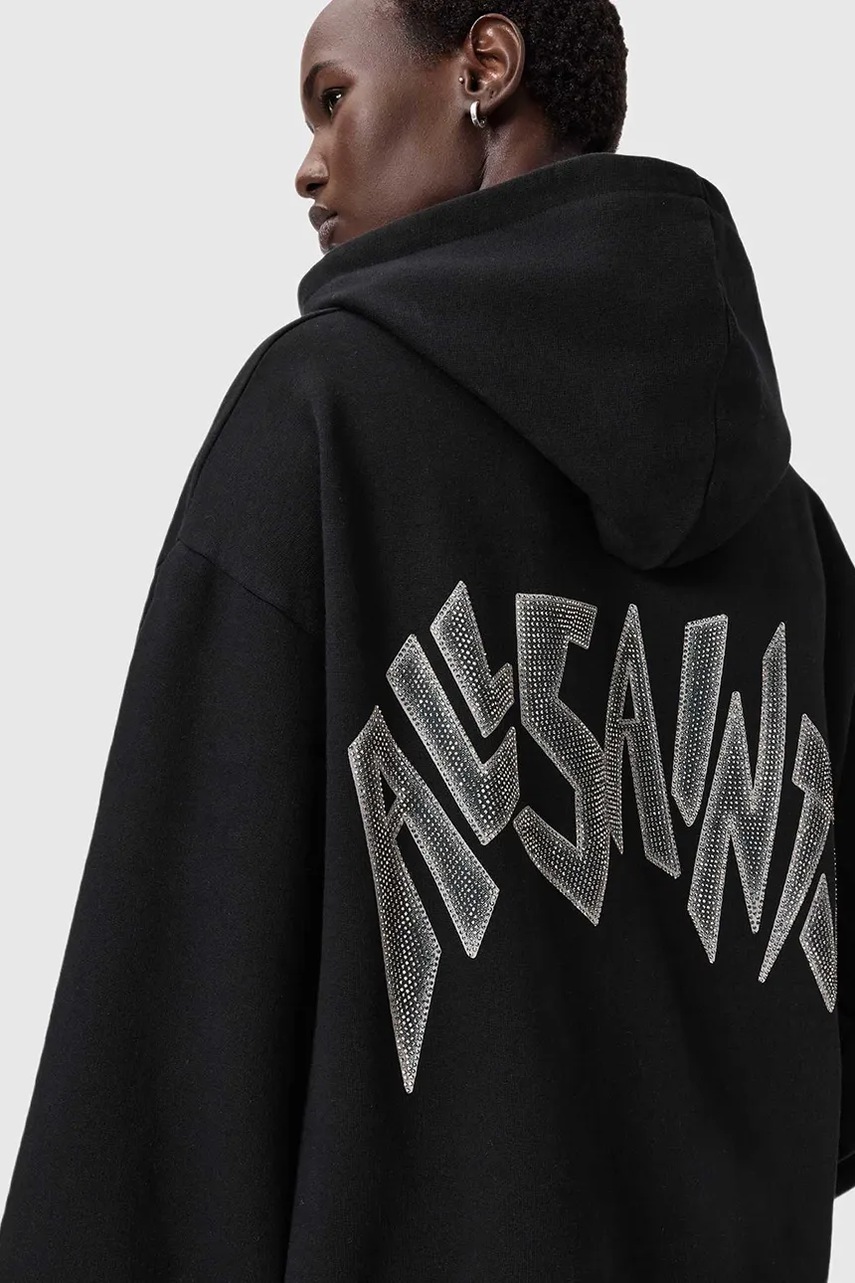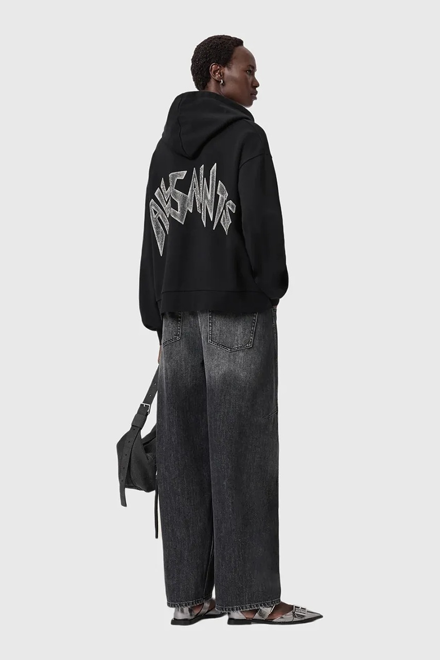 AllSaints bluza bawełniana damska kolor czarny z kapturem z aplikacją W090JD