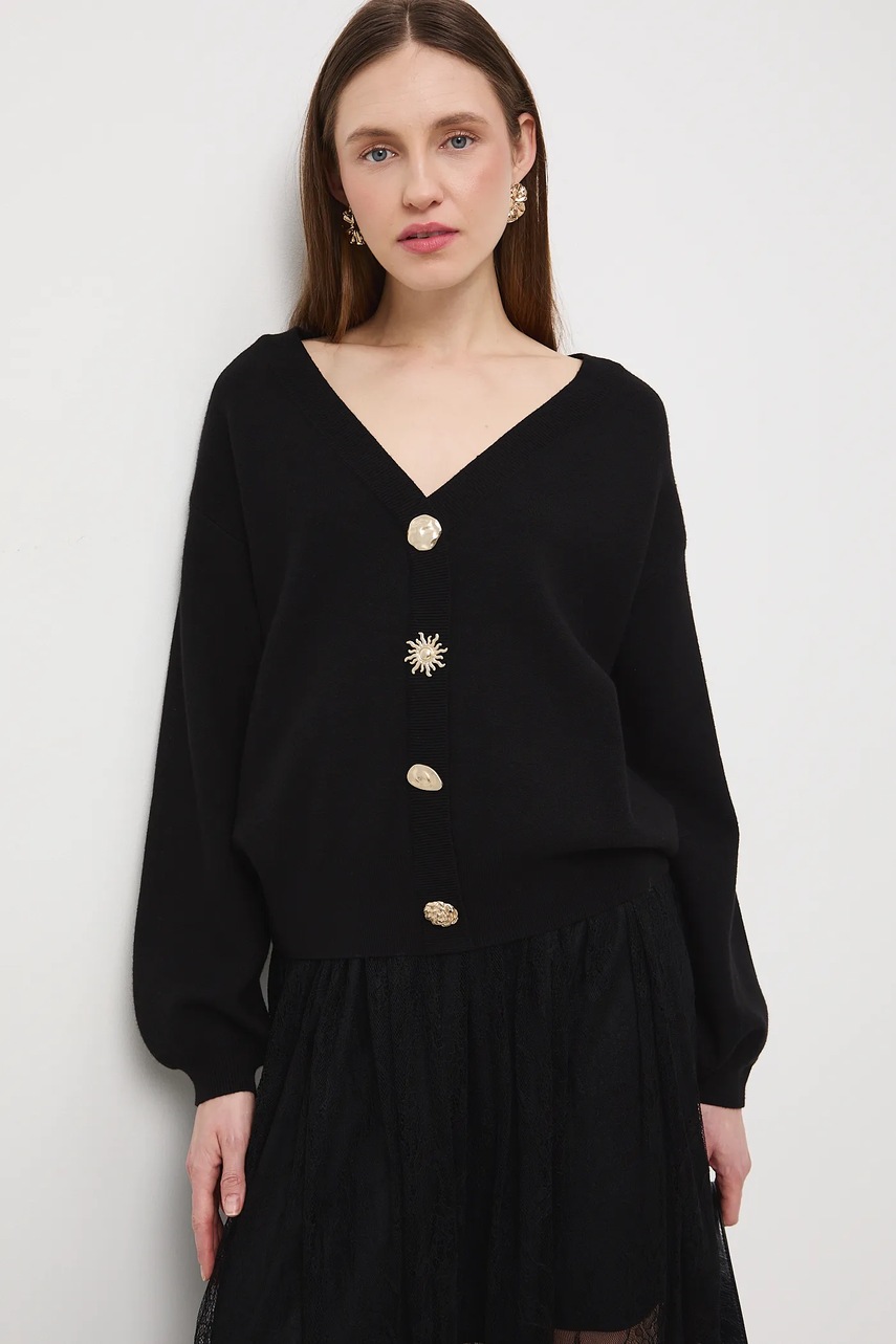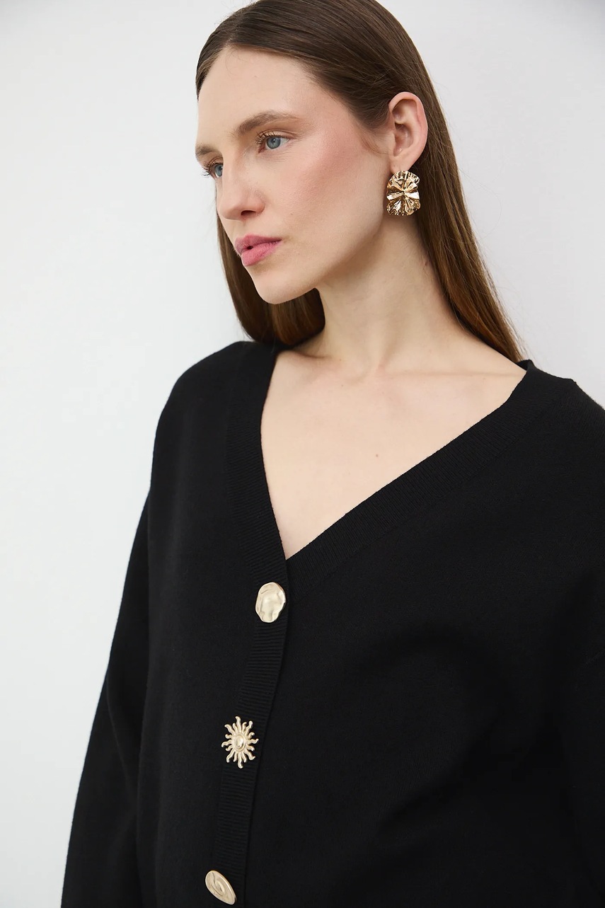 - Kardigan w fasonie regular zapewnia wygodę i uniwersalny wygląd. Delikatnie dopasowuje się do sylwetki, ale nie podkreśla jej nadmiernie. Klasyczny i prosty, sprawdzi się zarówno w eleganckich, jak i casualowych stylizacjach.