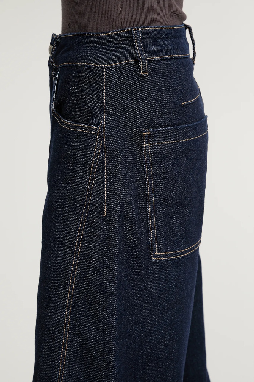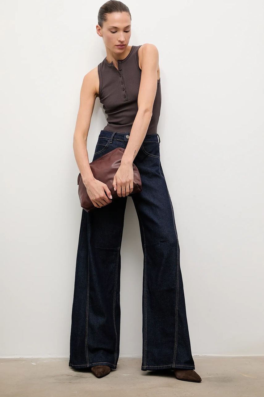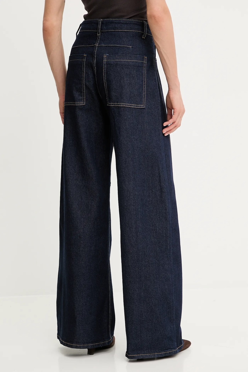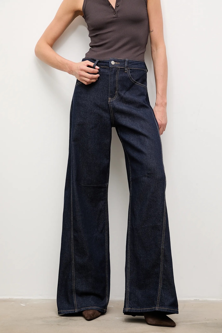 - Fason wide leg - jeansy lekko dopasowane w okolicy bioder z charakterystyczną szeroką nogawką, która stopniowo poszerza się od talii, aż do samego dołu. Krój akcentuje wcięcie w talii, a luźny dół nie krępuje ruchów.
