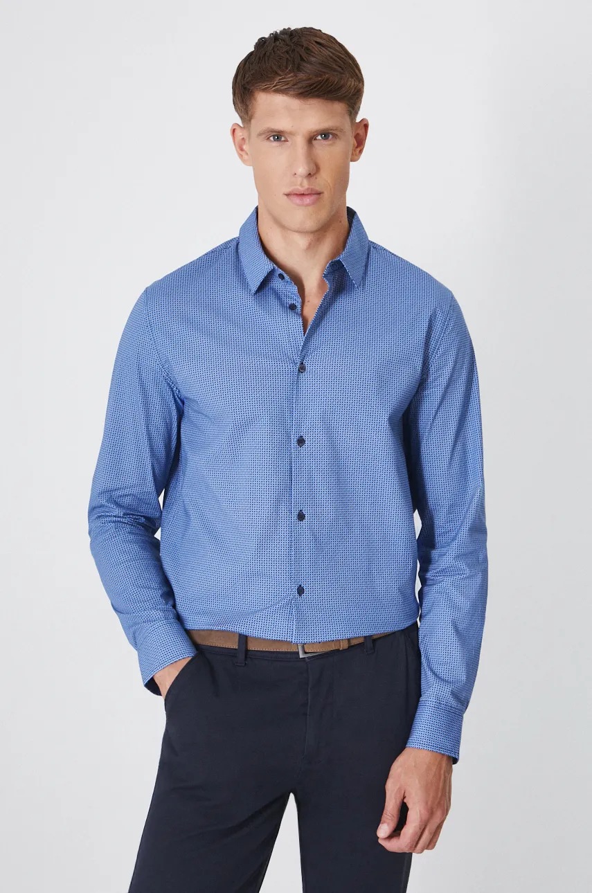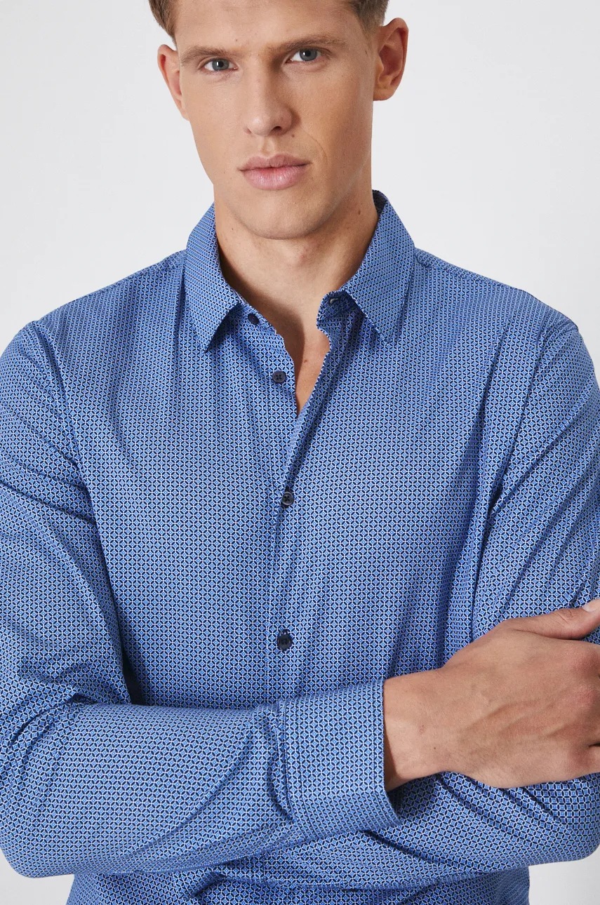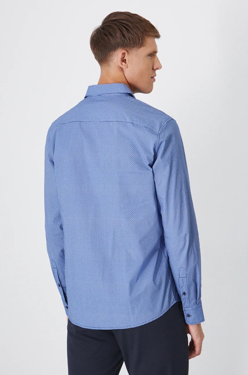 - Koszula w fasonie regular delikatnie dopasowuje się do sylwetki, ale nie podkreśla jej nadmiernie, zapewniając swobodę ruchów.