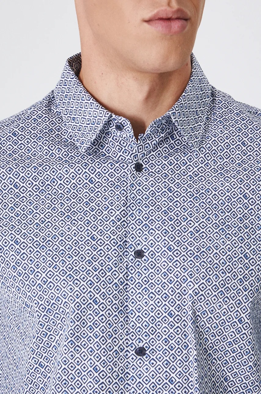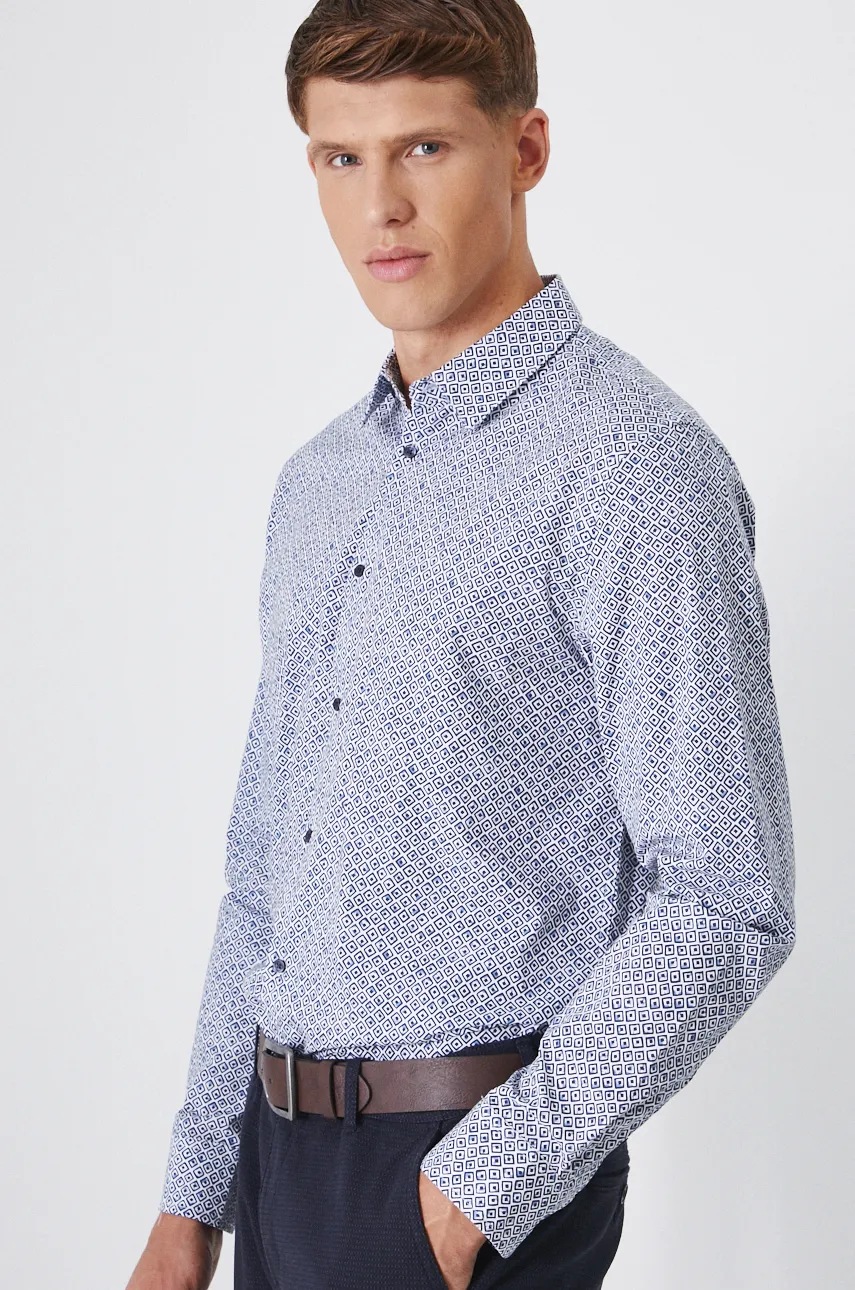 - Koszula w fasonie regular delikatnie dopasowuje się do sylwetki, ale nie podkreśla jej nadmiernie, zapewniając swobodę ruchów.