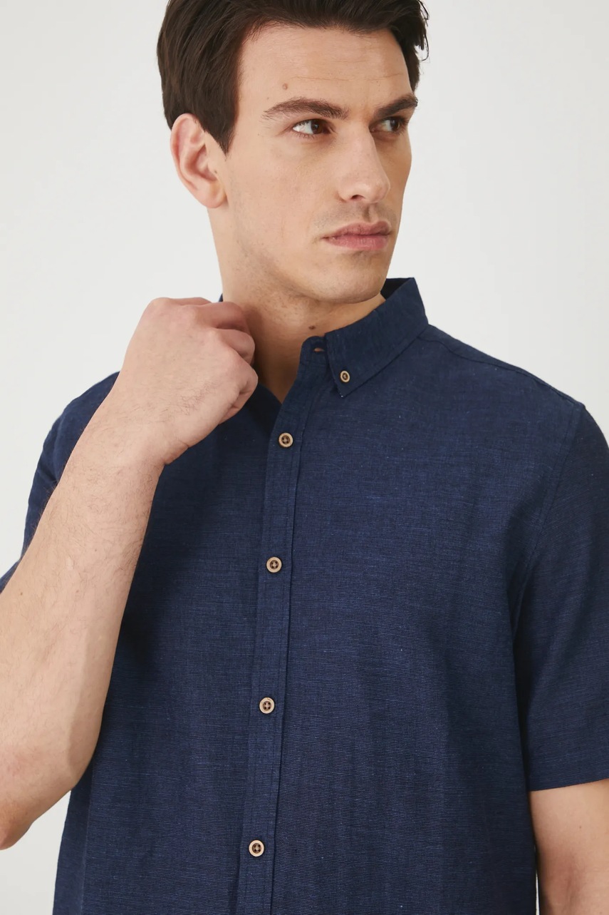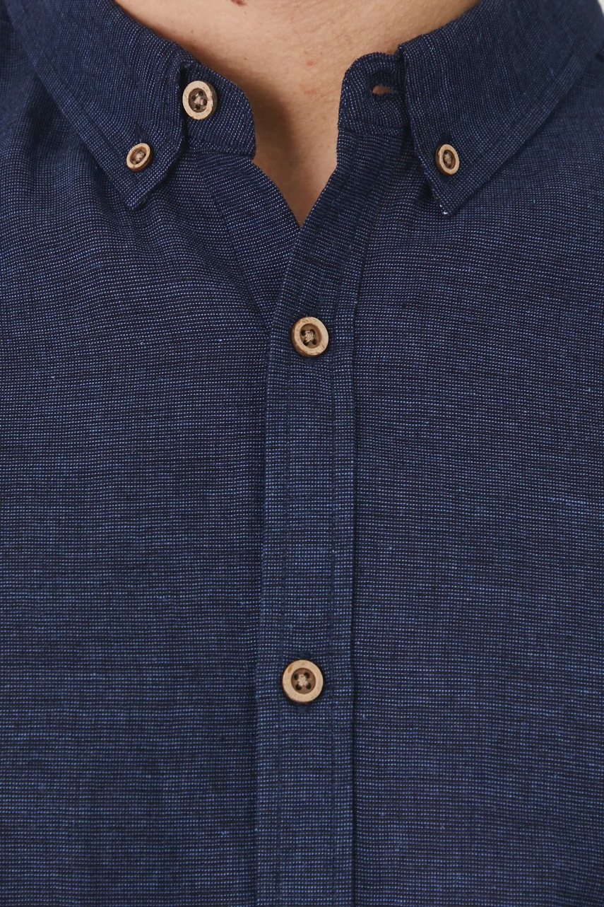 Medicine koszula lniana kolor granatowy regular z kołnierzykiem button-down