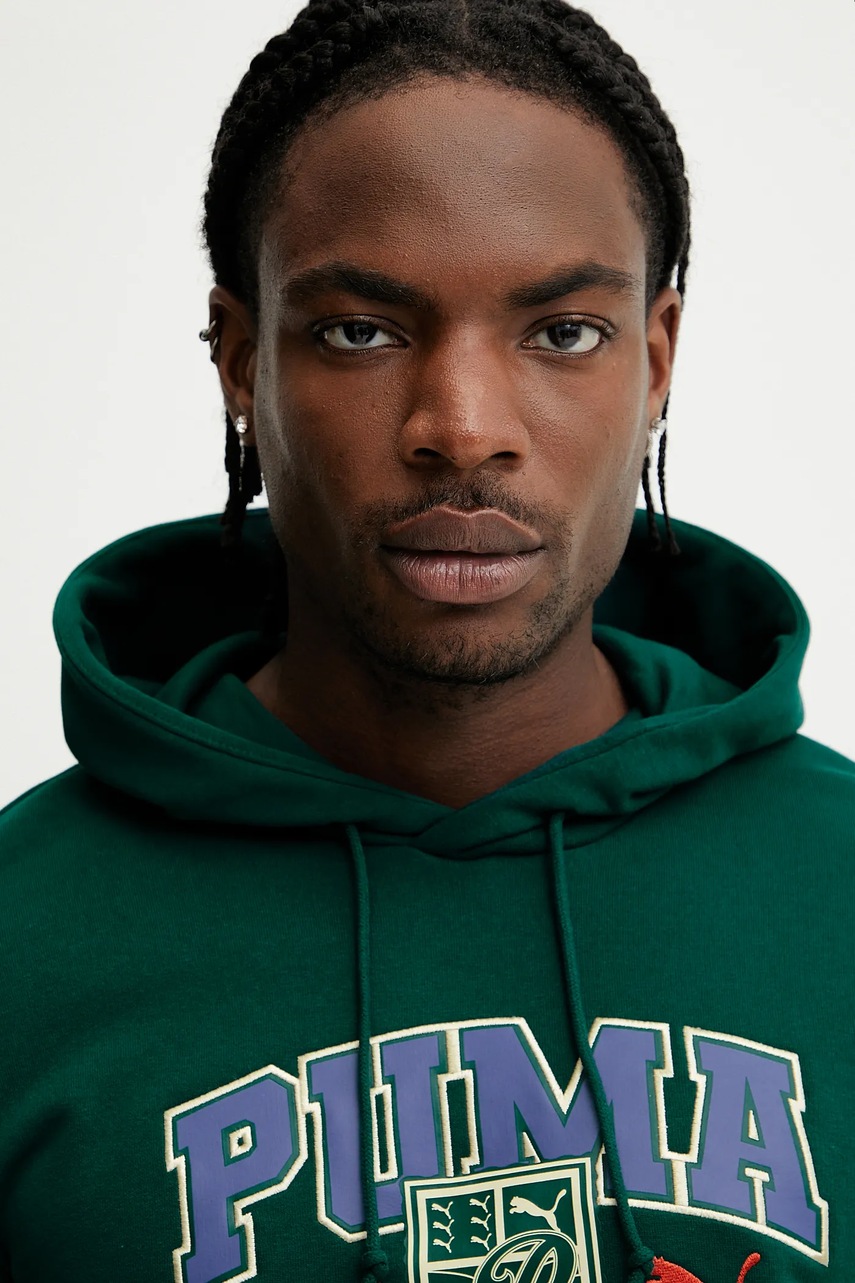 Puma bluza bawełniana męska kolor zielony z kapturem z nadrukiem 629629