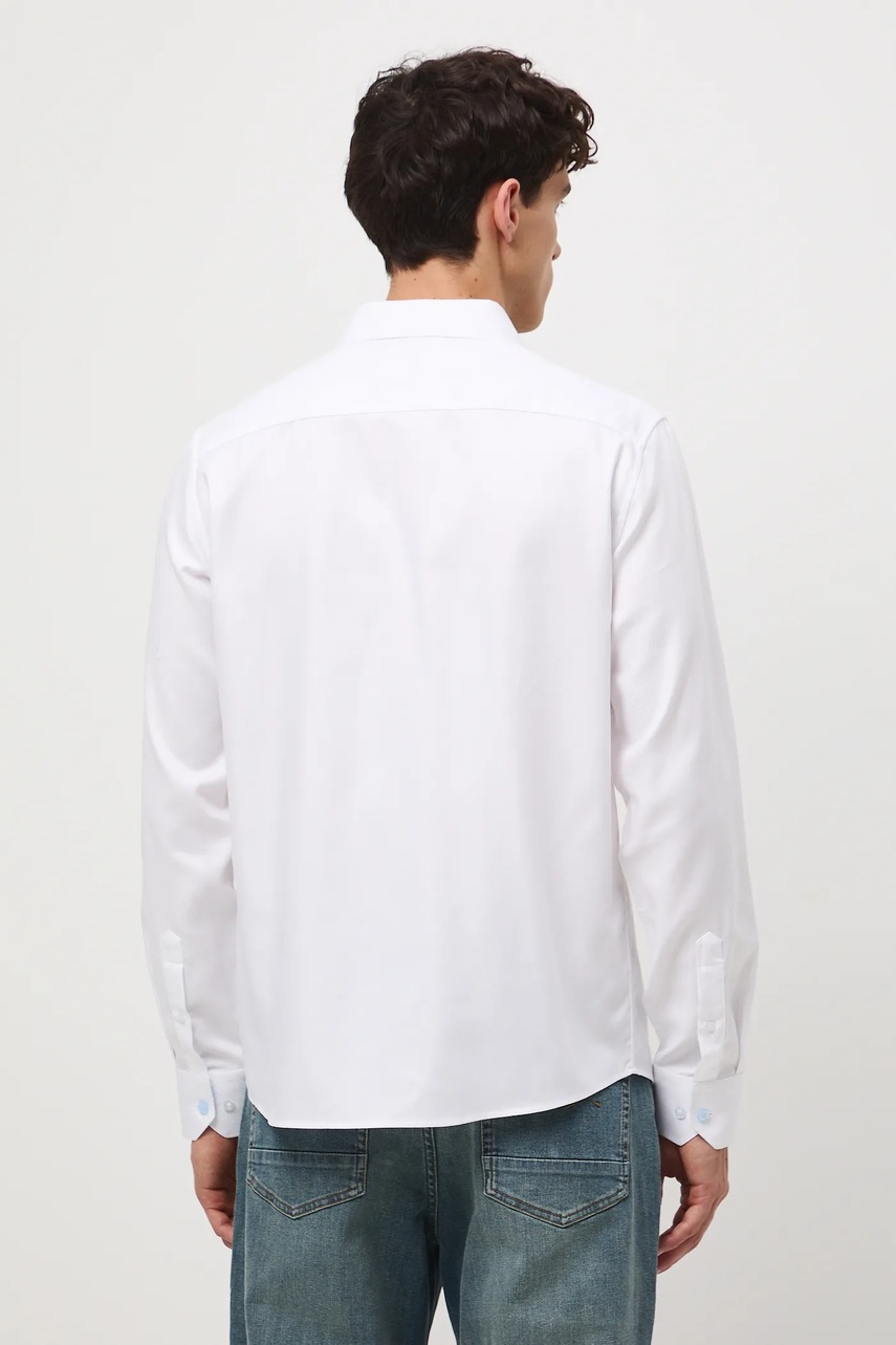 - Koszula w fasonie regular delikatnie dopasowuje się do sylwetki, ale nie podkreśla jej nadmiernie, zapewniając swobodę ruchów.