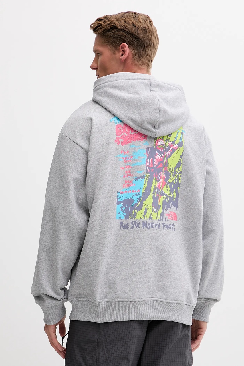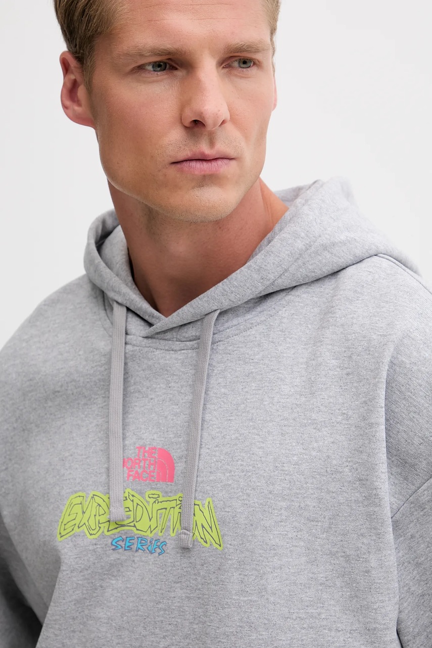 The North Face bluza Expedition Celebration męska kolor szary z kapturem z nadrukiem NF0A8E3FDYX1