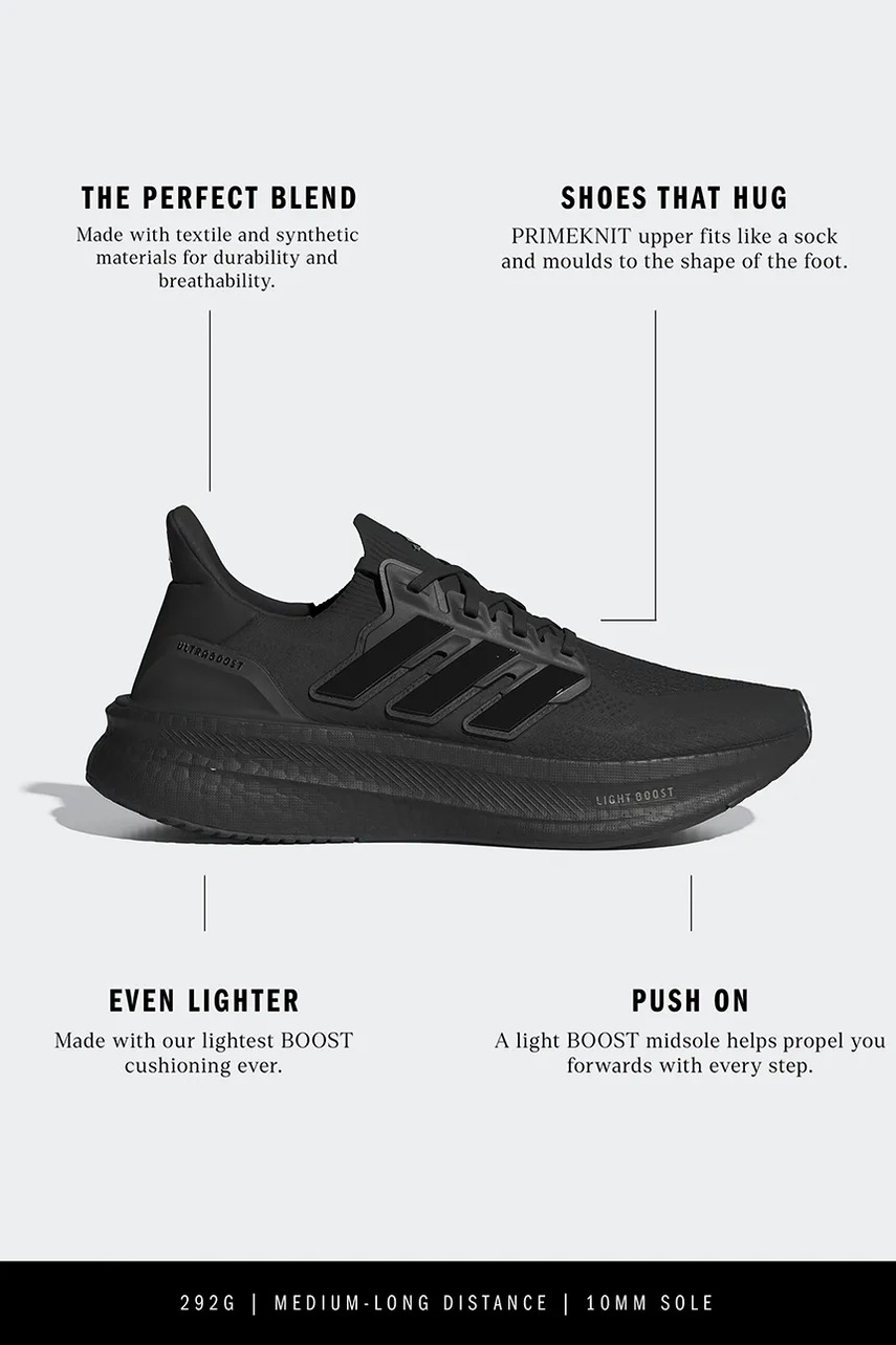 - Innowacyjna, lżejsza od poprzedniej wersji, podeszwa środkowa Boost Light, zwraca energię włożoną w ruch. Jednocześnie, pomimo mniejszej wagi, pianka ta doskonale amortyzuje stopę, pozwalając na jej optymalną adaptację na nierównych nawierzchniach.