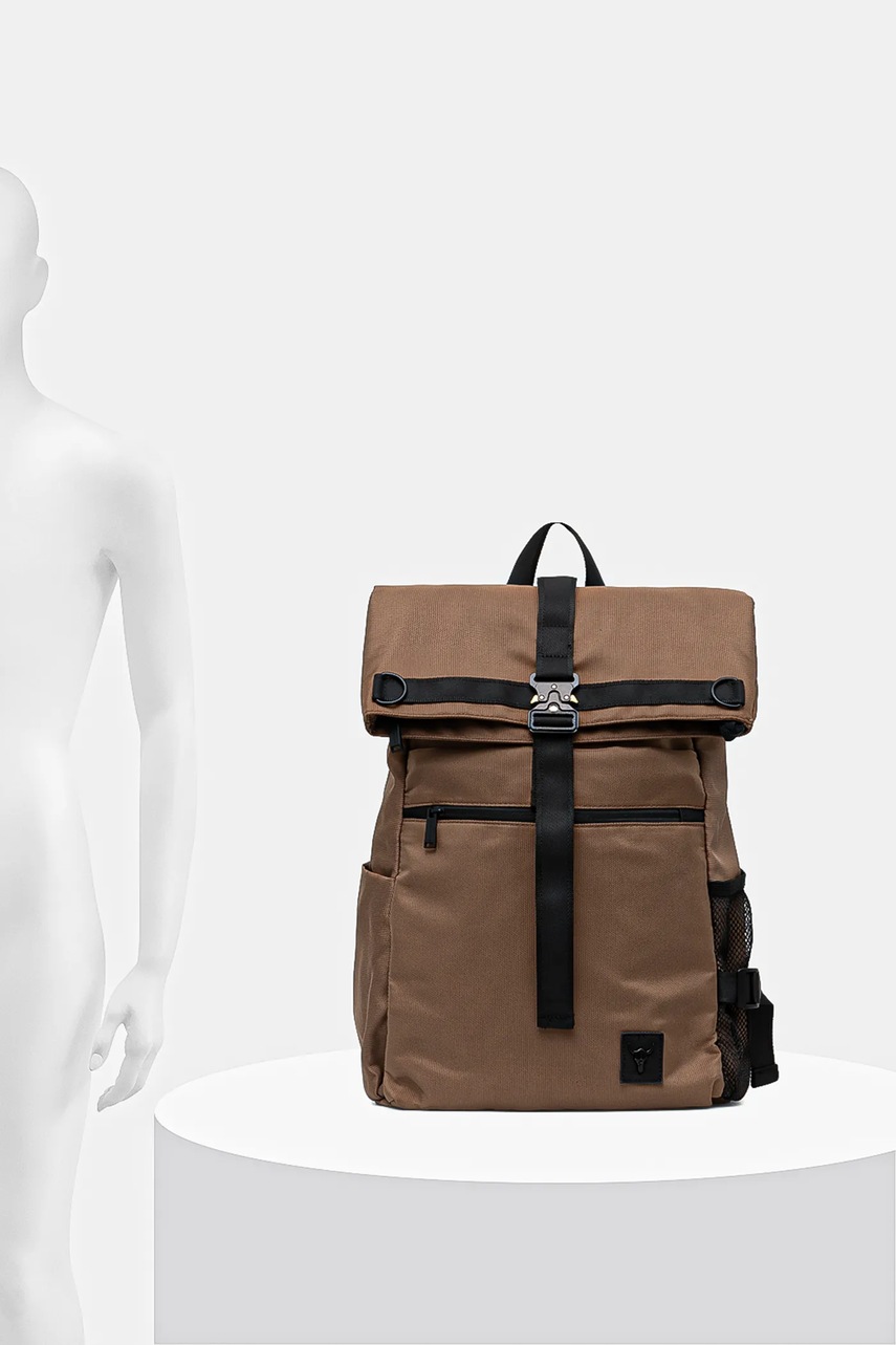 - Dwie kieszenie boczne: materiałowa z regulacją pojemności na suwak oraz siateczkowa z dodatkowym pasem kompresyjnym umożliwiającym zabezpieczenie zawartości.