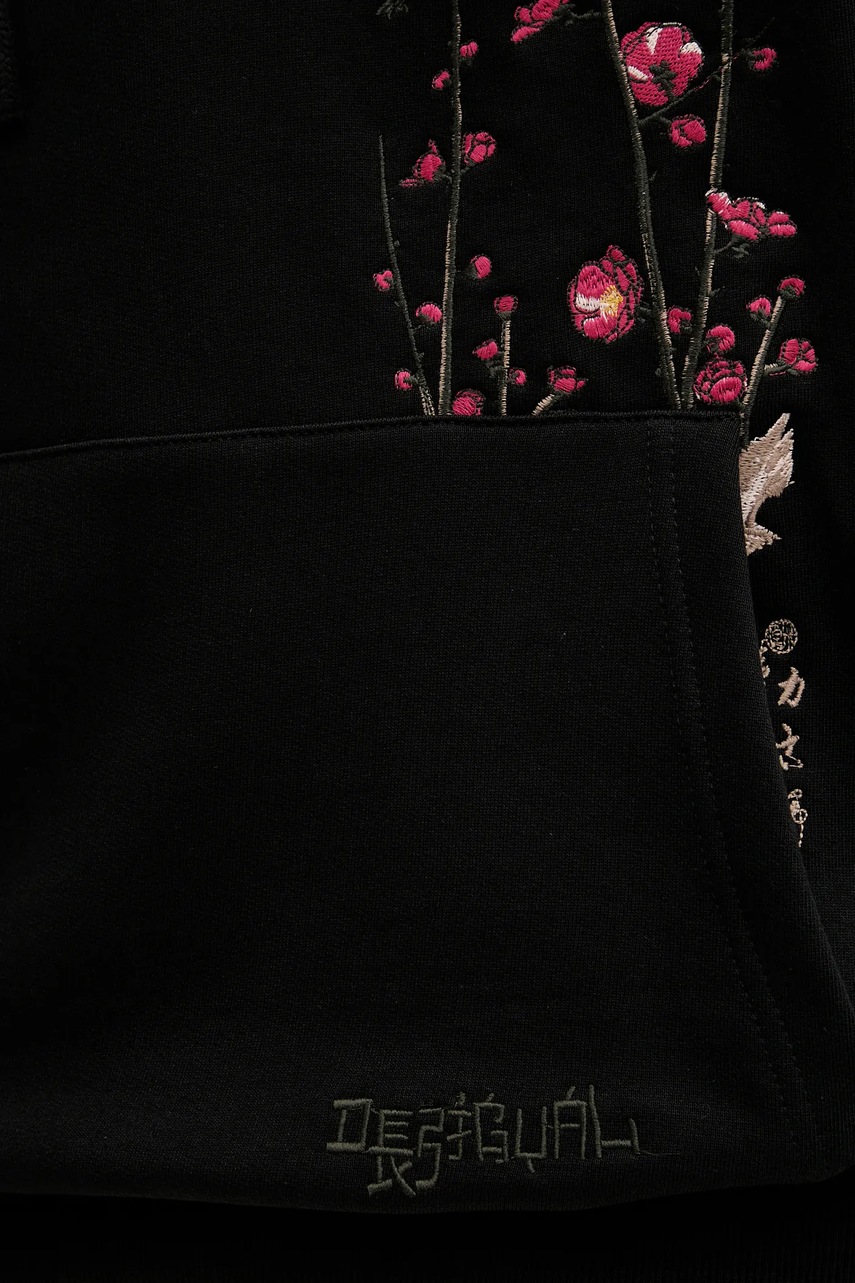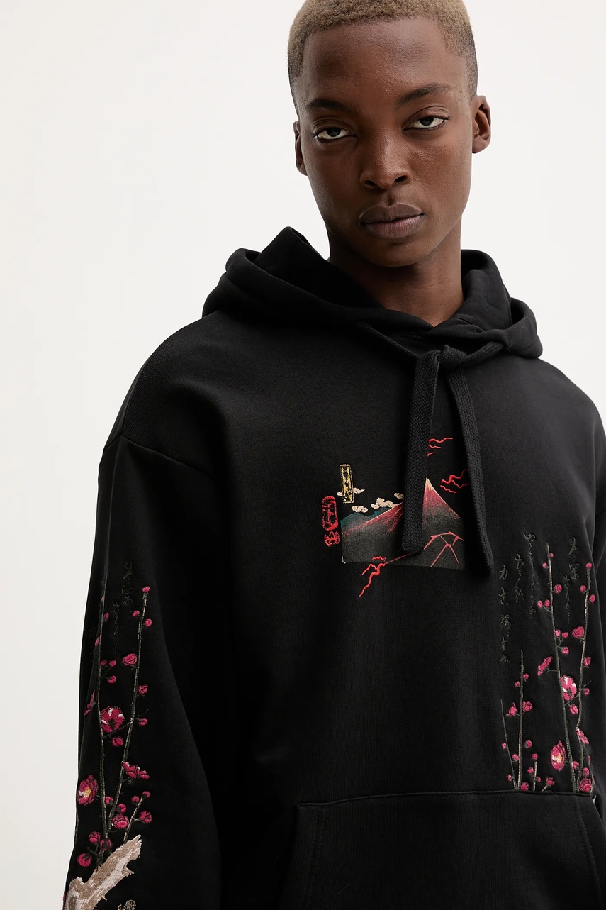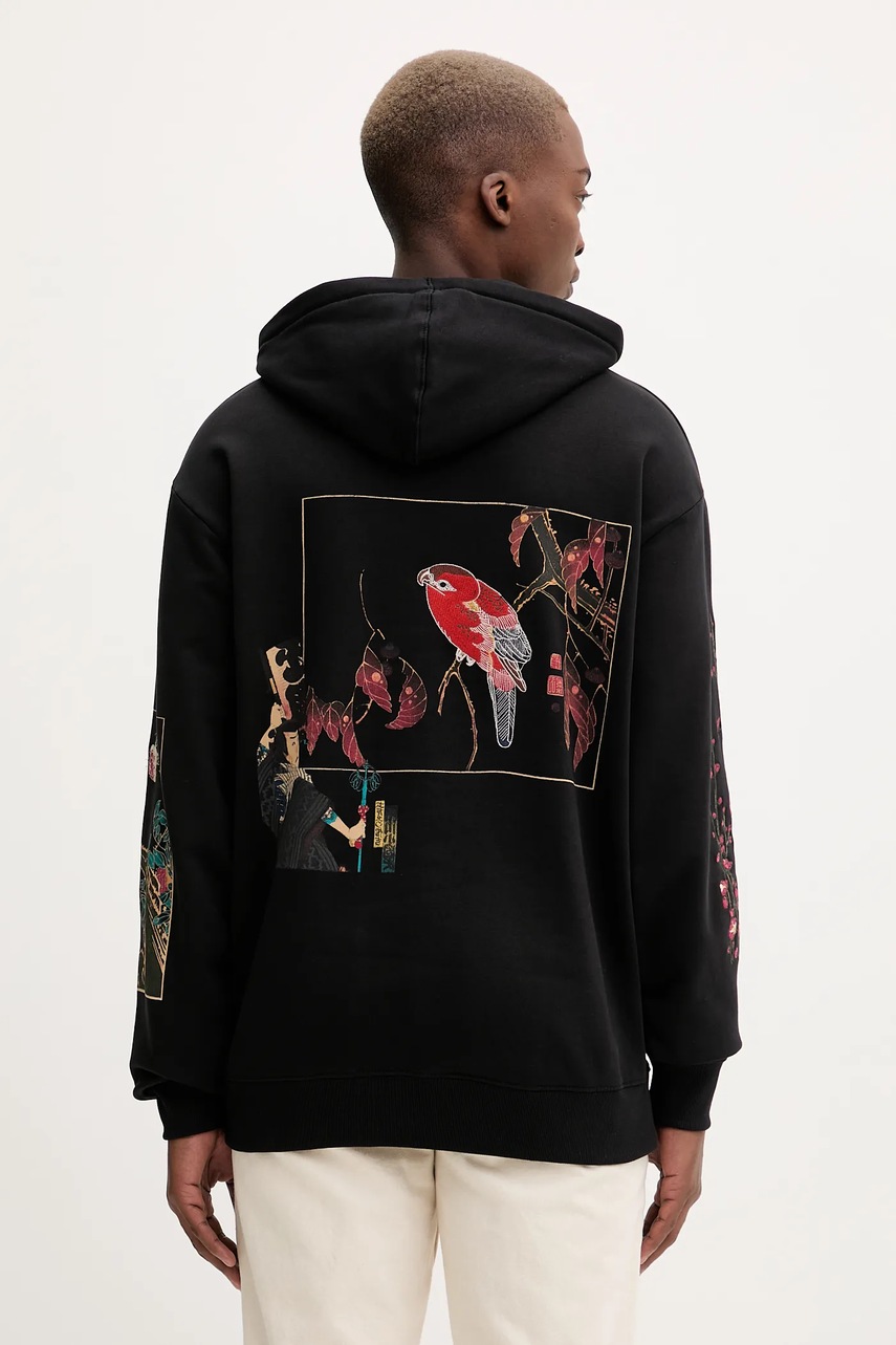 Desigual bluza bawełniana POSTCARDS męska kolor czarny z kapturem z aplikacją 25WMSK13