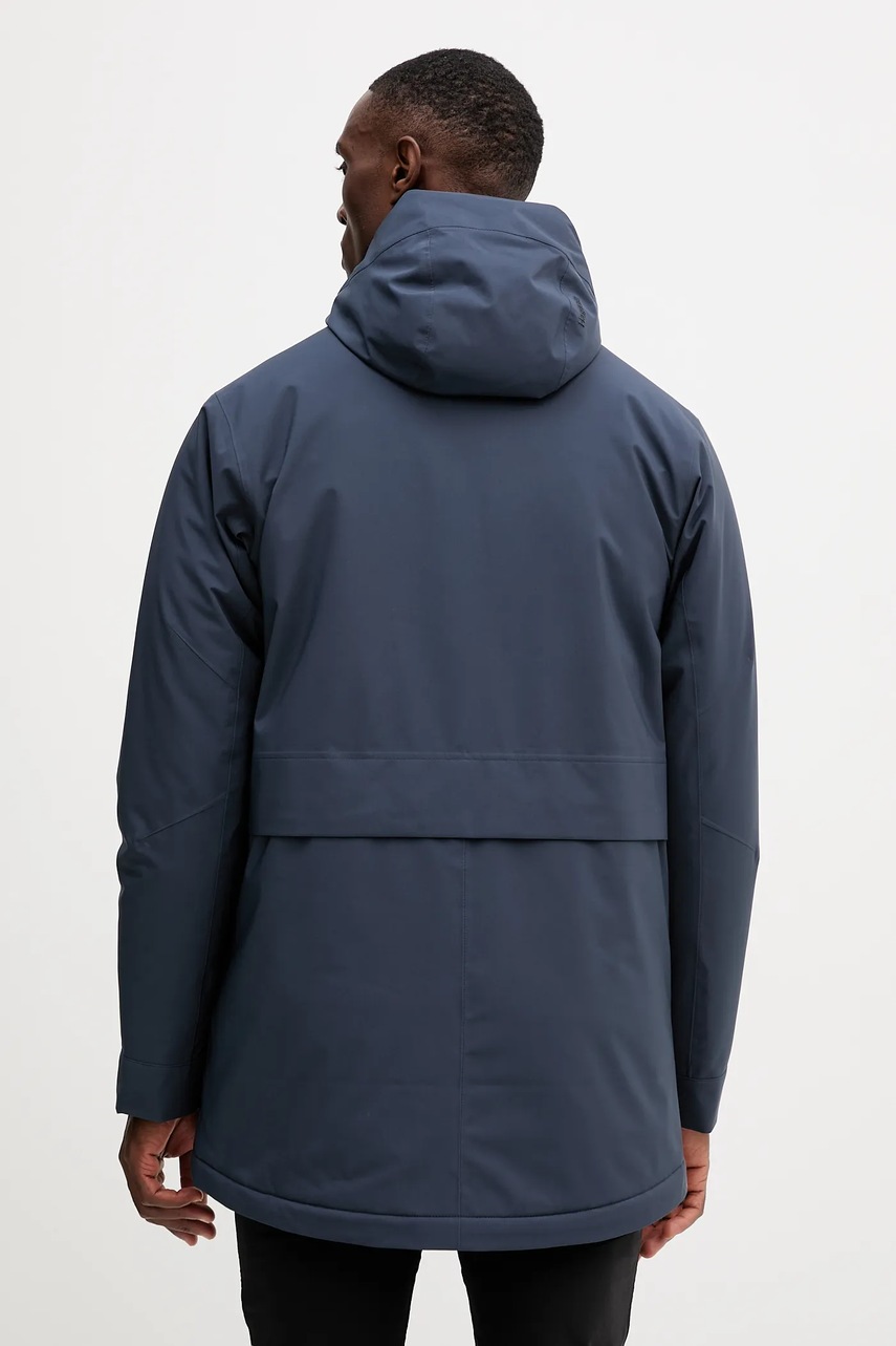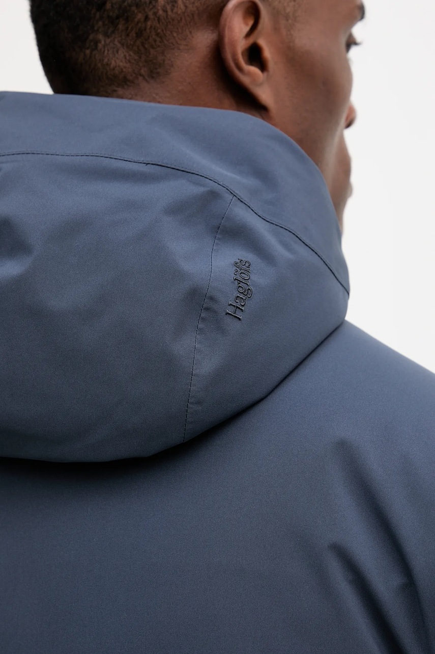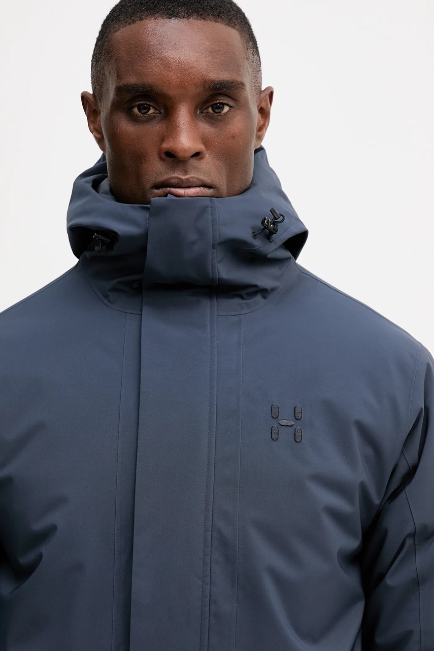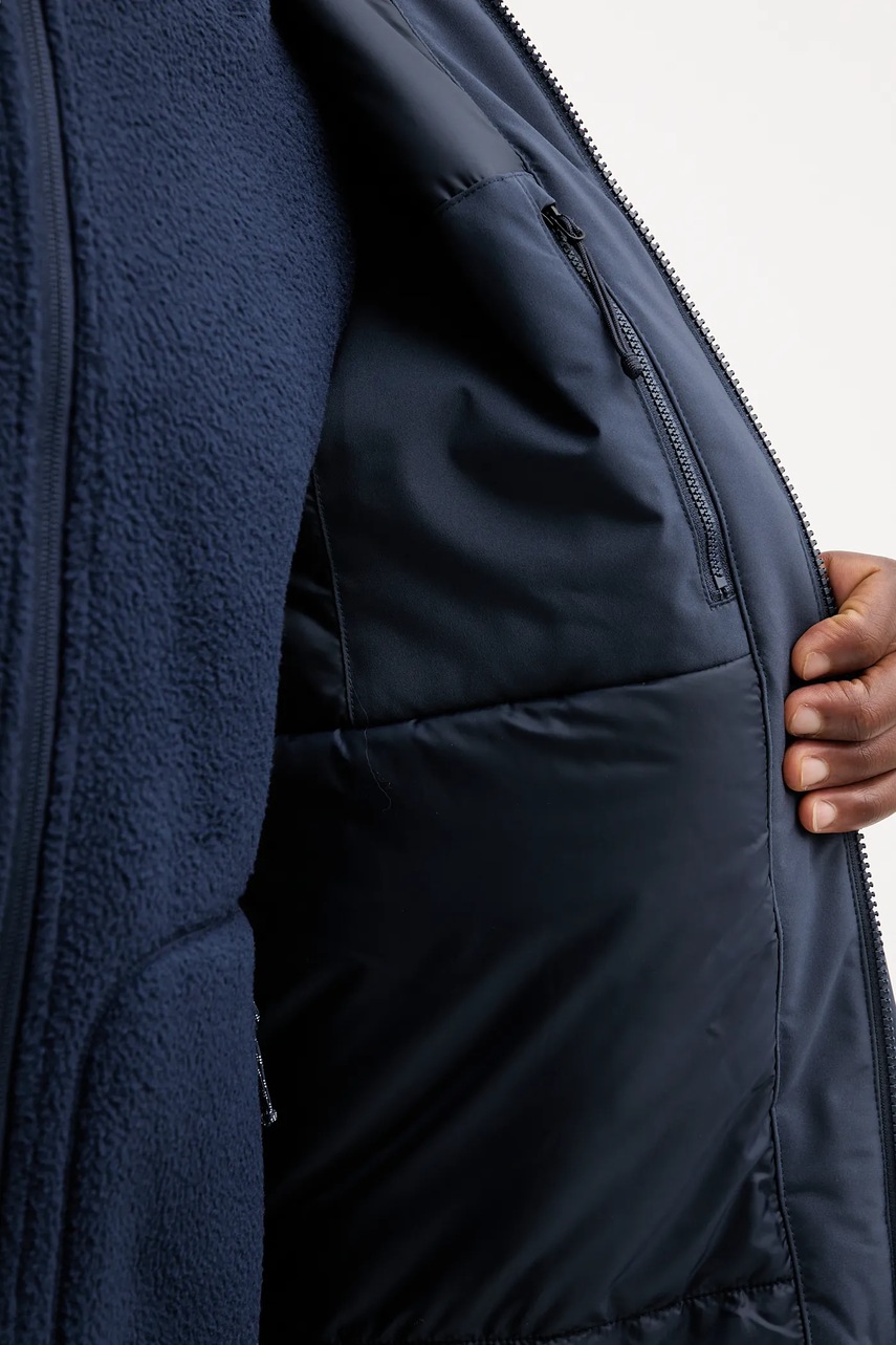- Mocno zabudowany, podwyższony kołnierz z osłoną podbródka i kaptur z regulacją za pomocą troczków, zapewniają ochronę przed zimnem, wiatrem i opadami śniegu lub deszczu.