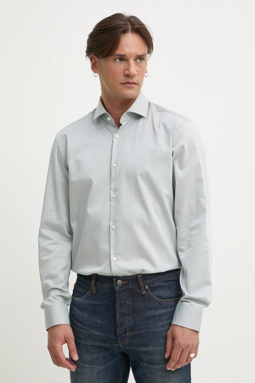 HUGO koszula bawełniana męska kolor zielony slim z kołnierzykiem włoskim