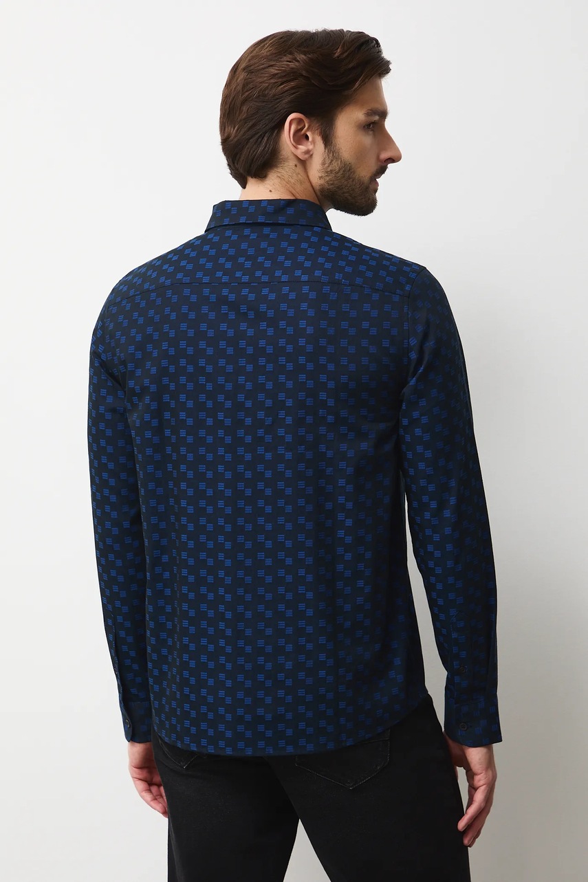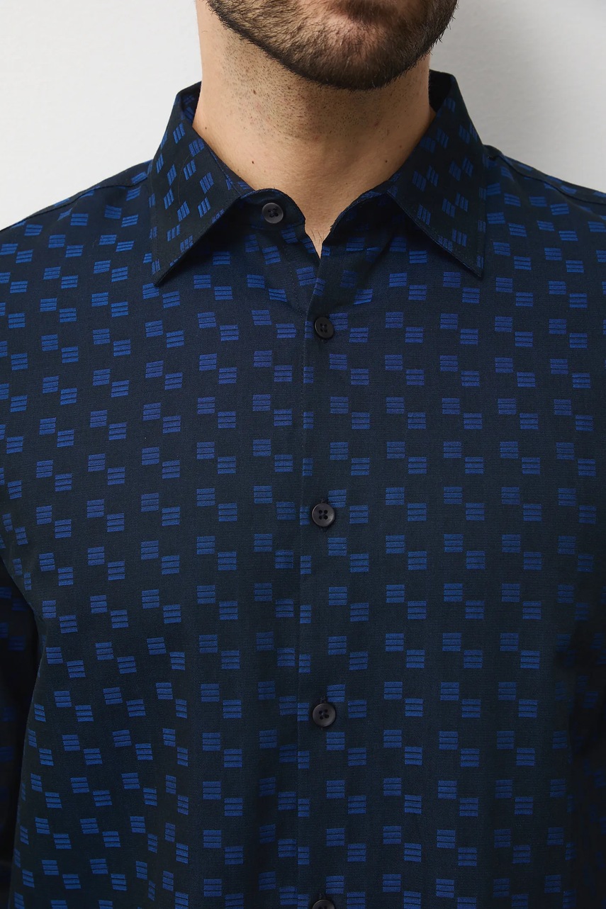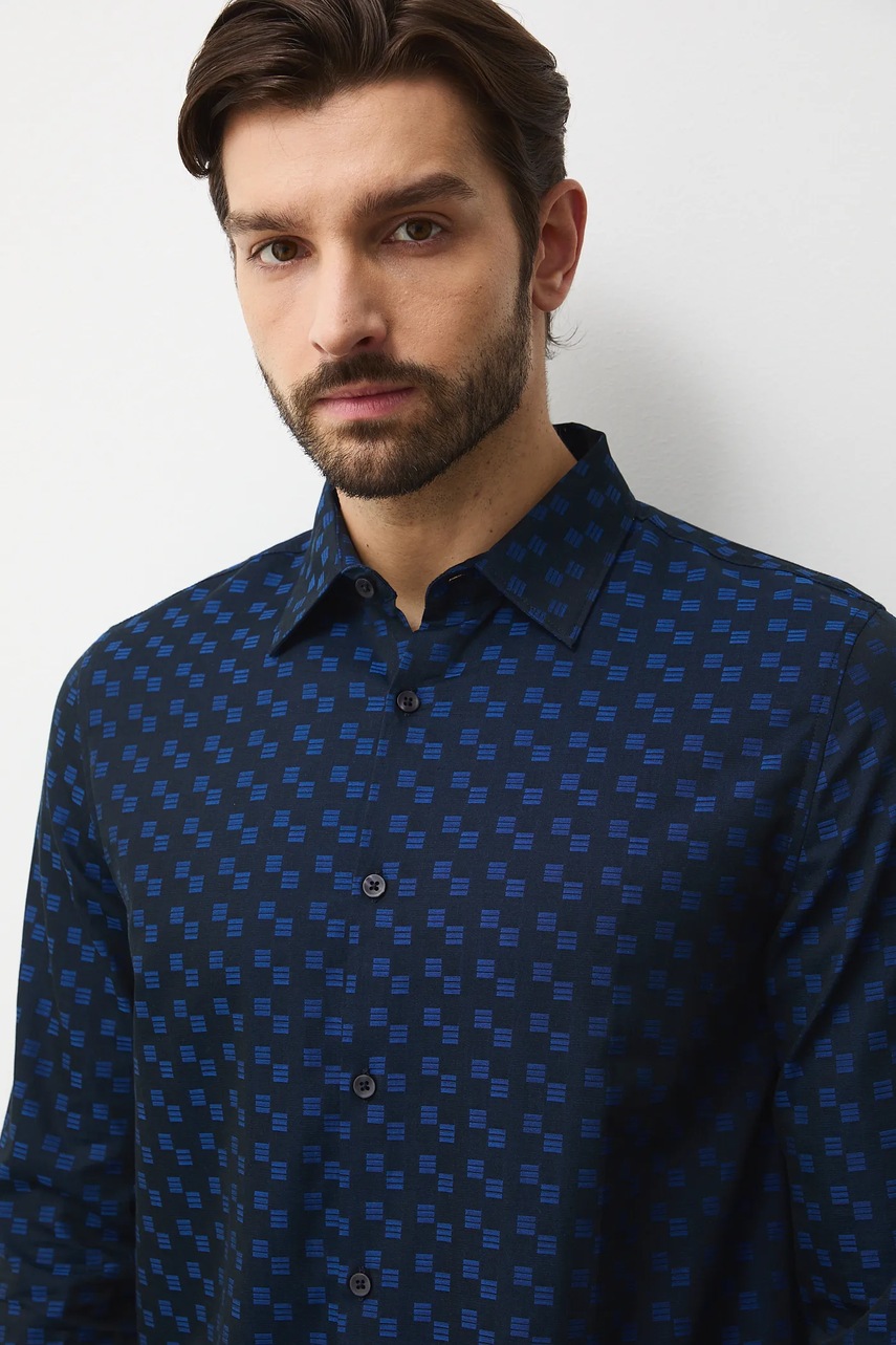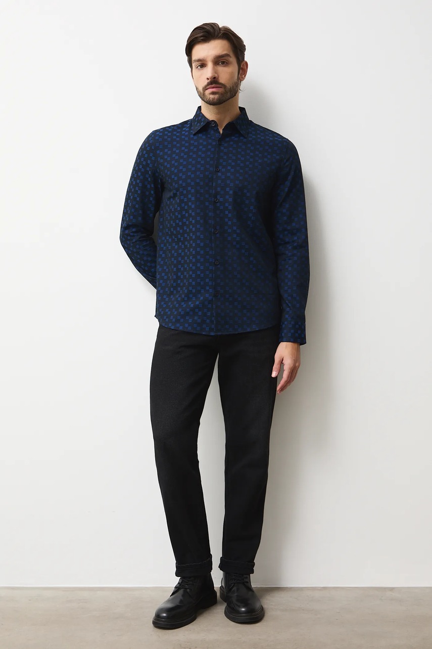 - Koszula w fasonie regular delikatnie dopasowuje się do sylwetki, ale nie podkreśla jej nadmiernie, zapewniając swobodę ruchów.